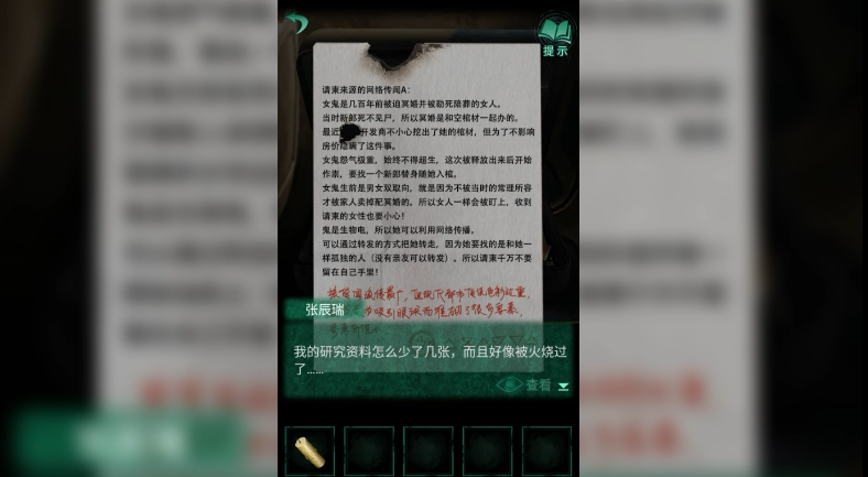 在《红丝缠》里,我看到了创作团队把更多的解谜关键放在了相关的文本里,比如张辰瑞的调查文件。