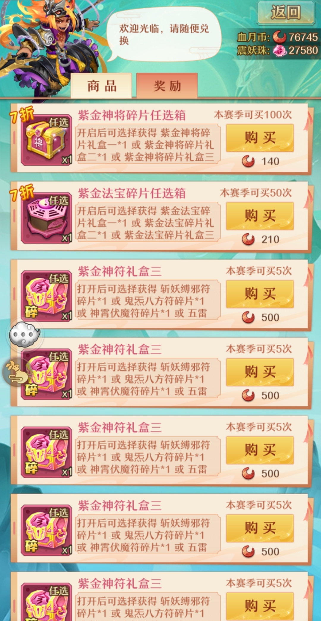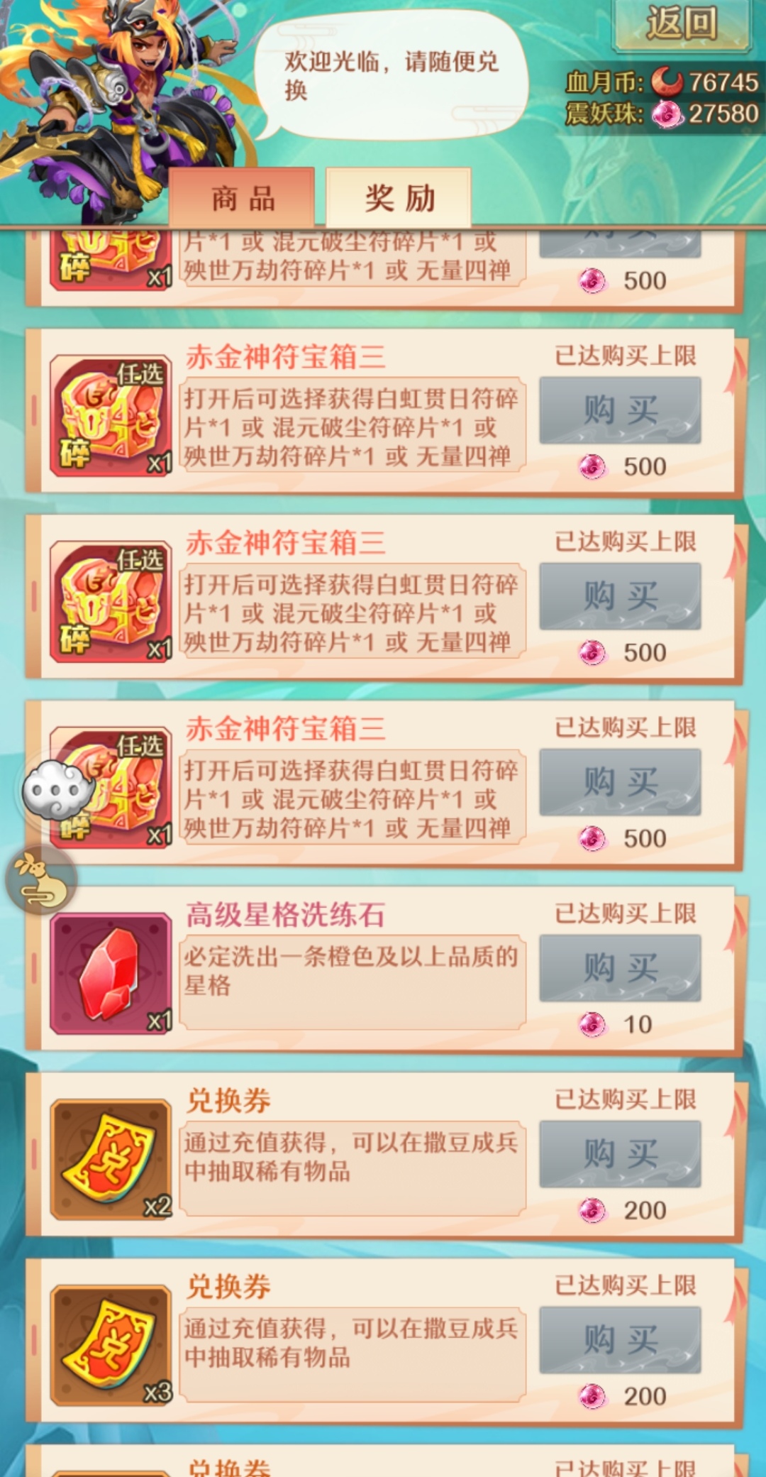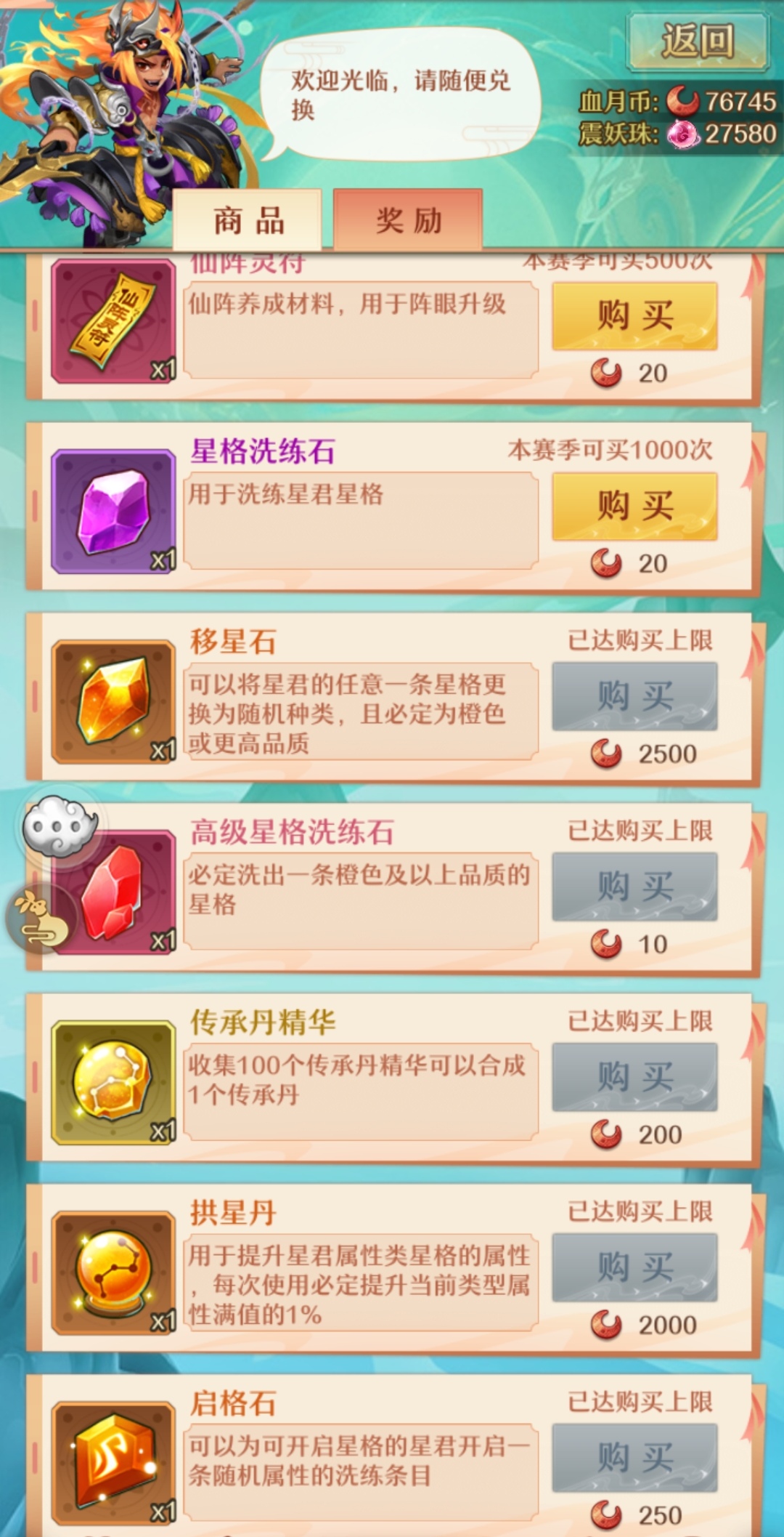 血月商店的购买货币为血月币和镇妖珠。