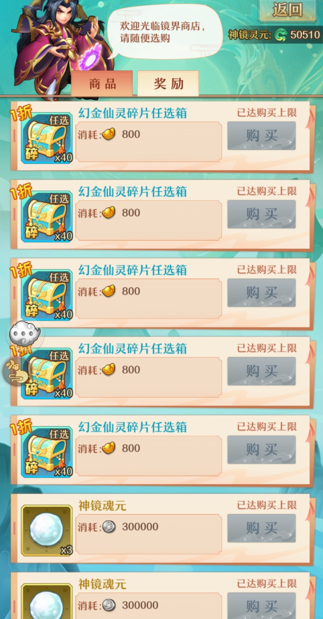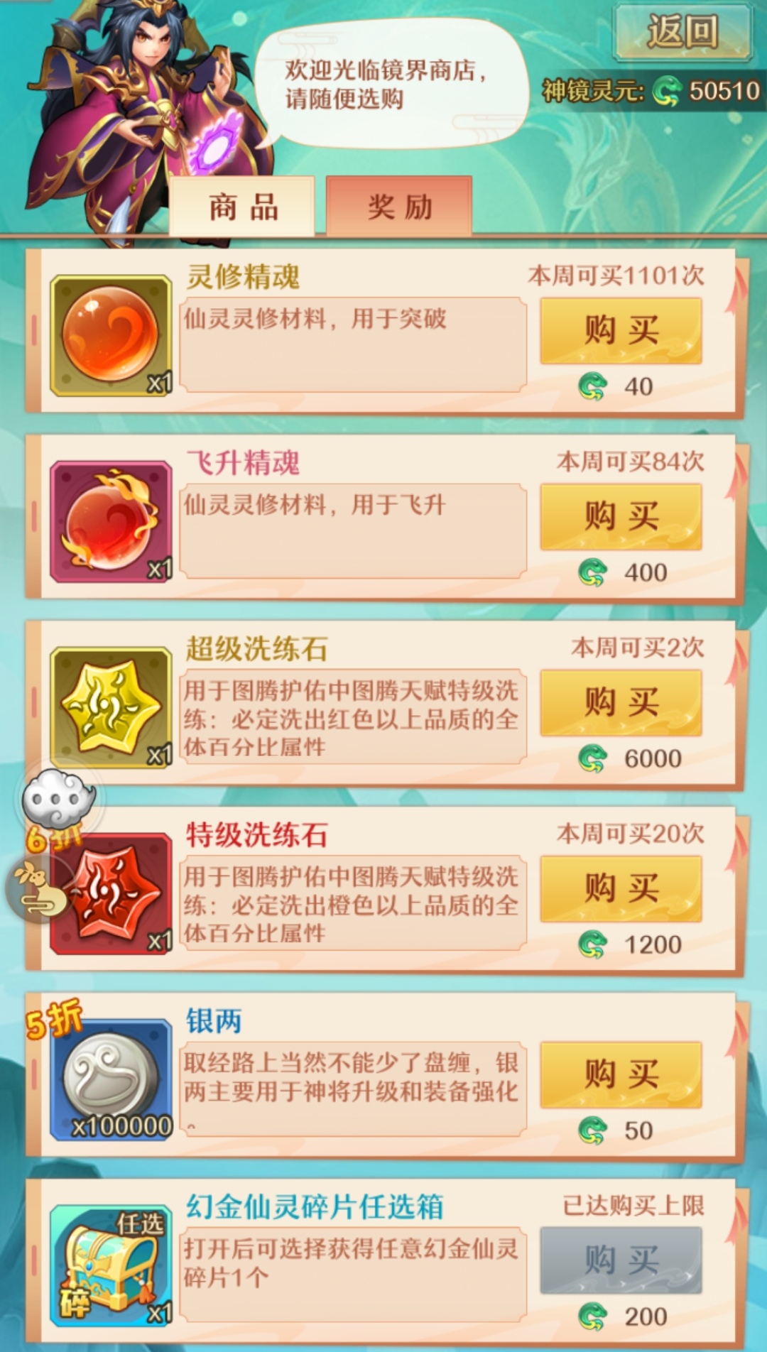 境界商店的具体购买货币为神境灵元。