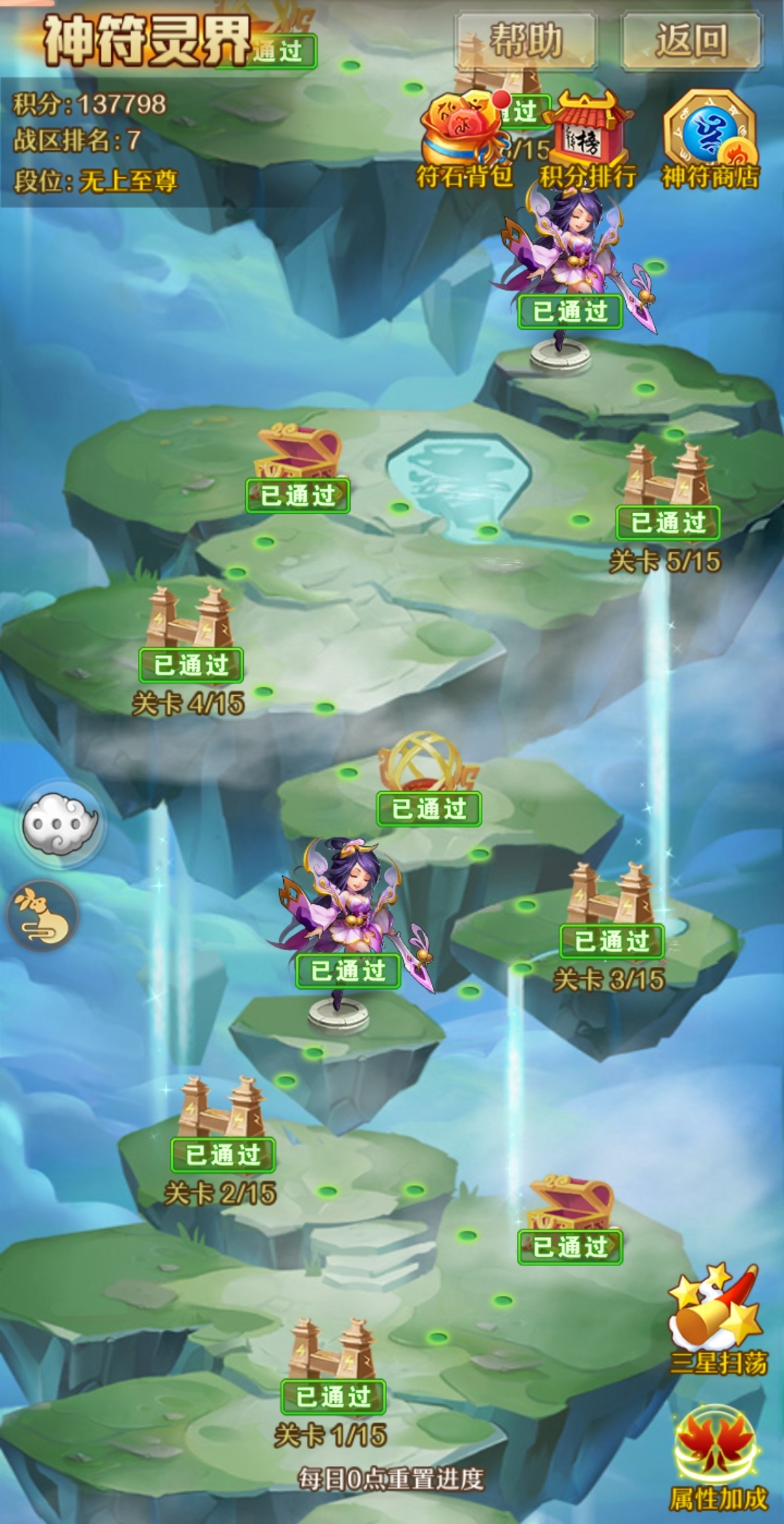 神符灵界每天0点重置进度,总共15个关卡,每个关卡后面都会有奖励事件(宝箱、状态、礼物)