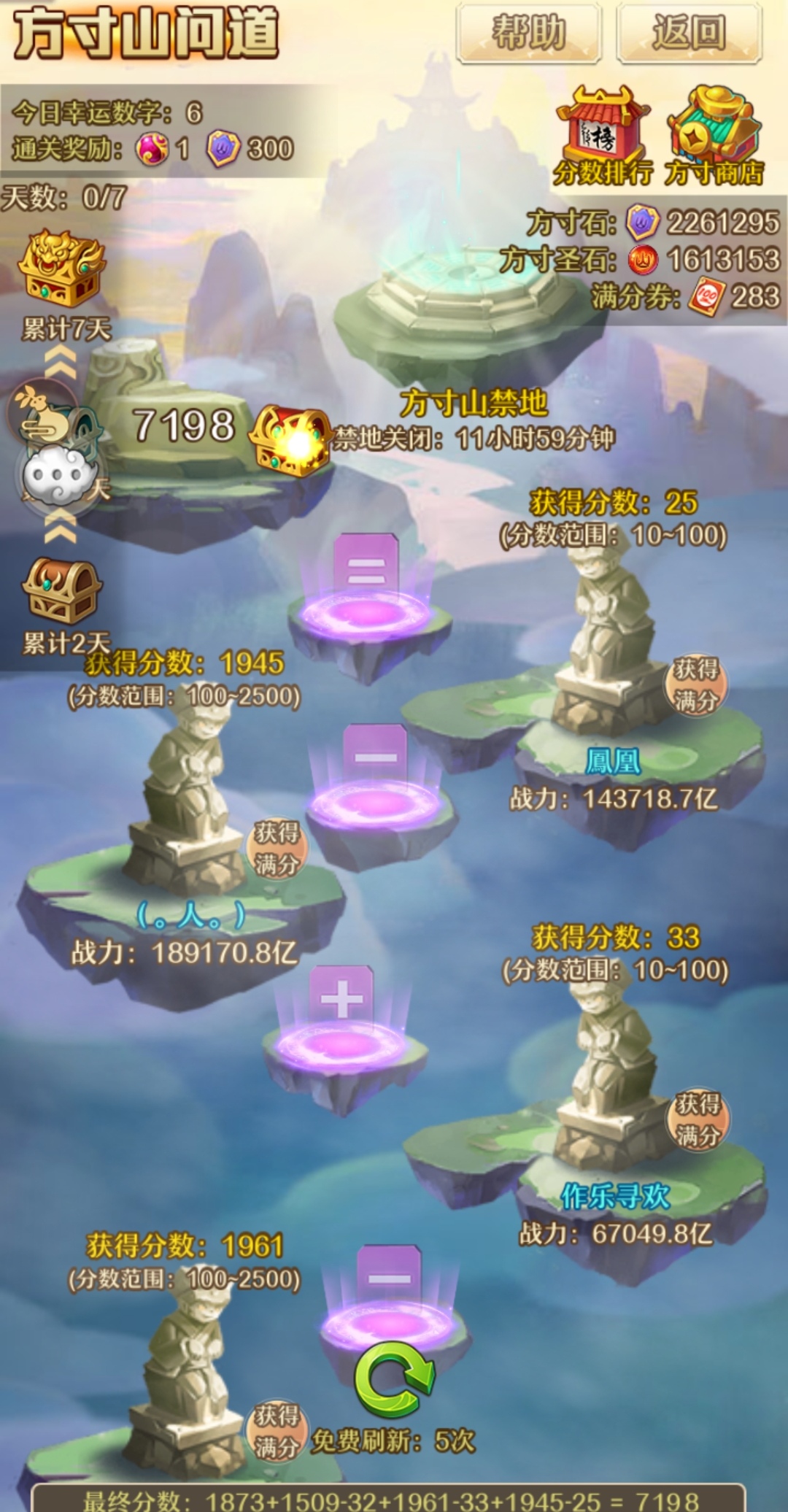获得最终分数后,每含有1个幸运数字,可获得100元宝奖励,最多为500元宝奖励。