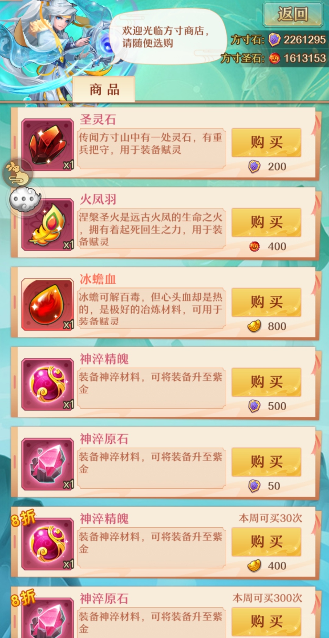 1,方寸商店,前期购买优先级。【冰残血>火凤羽>圣灵石>神淬精魄>神翠原石>晶魄灵石>金装之灵任选项】