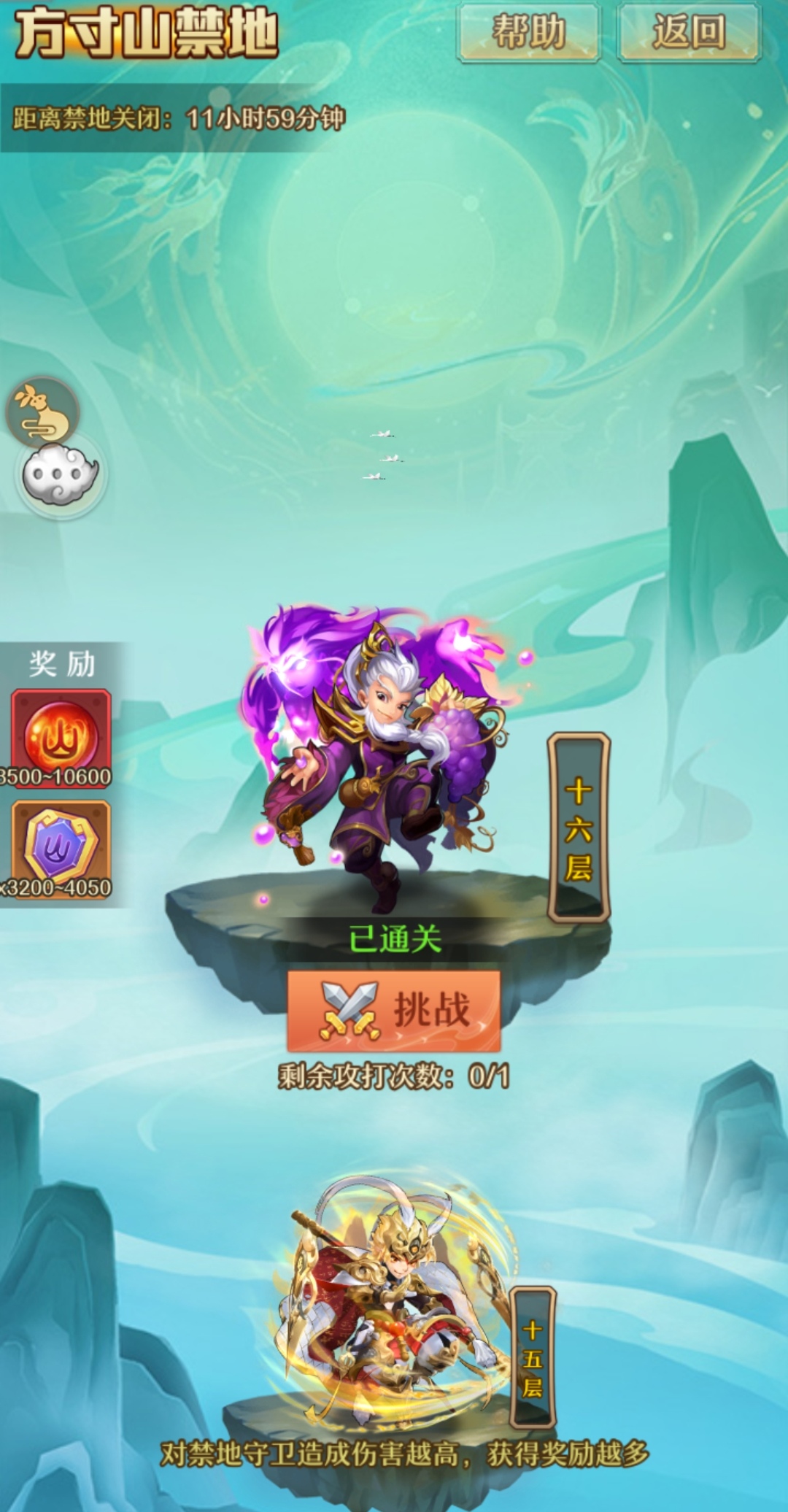 通关禁地上1层后,下次进人禁地将可攻打下一次守卫。