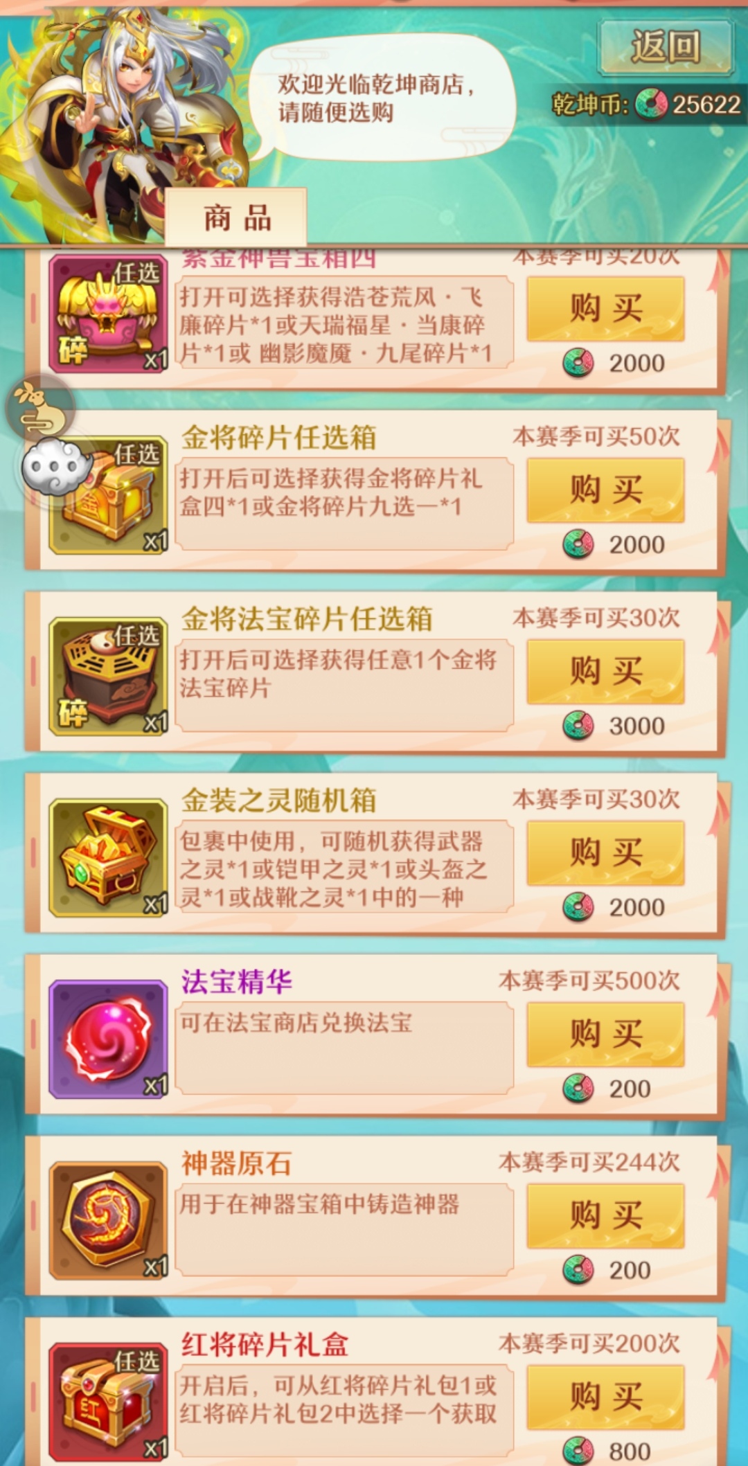 1,乾坤商店前期购买优先级。【紫金神兽宝箱>神器原石>金装之灵水机箱>金将碎片>金将法宝碎片】