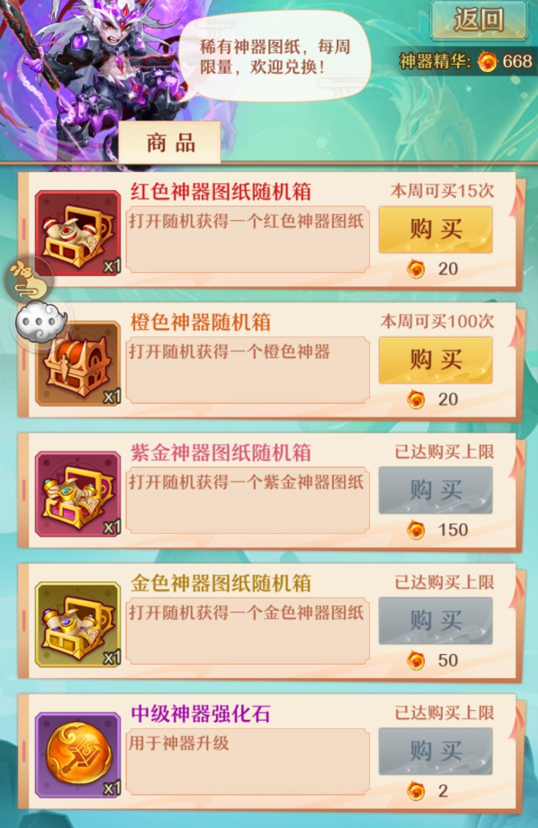 1,神器商店的购买优先级。【紫金神器图纸随机箱>金色神器图纸随机箱>红色神器图纸随机箱>中极神器强化石>橙色神器随机箱】