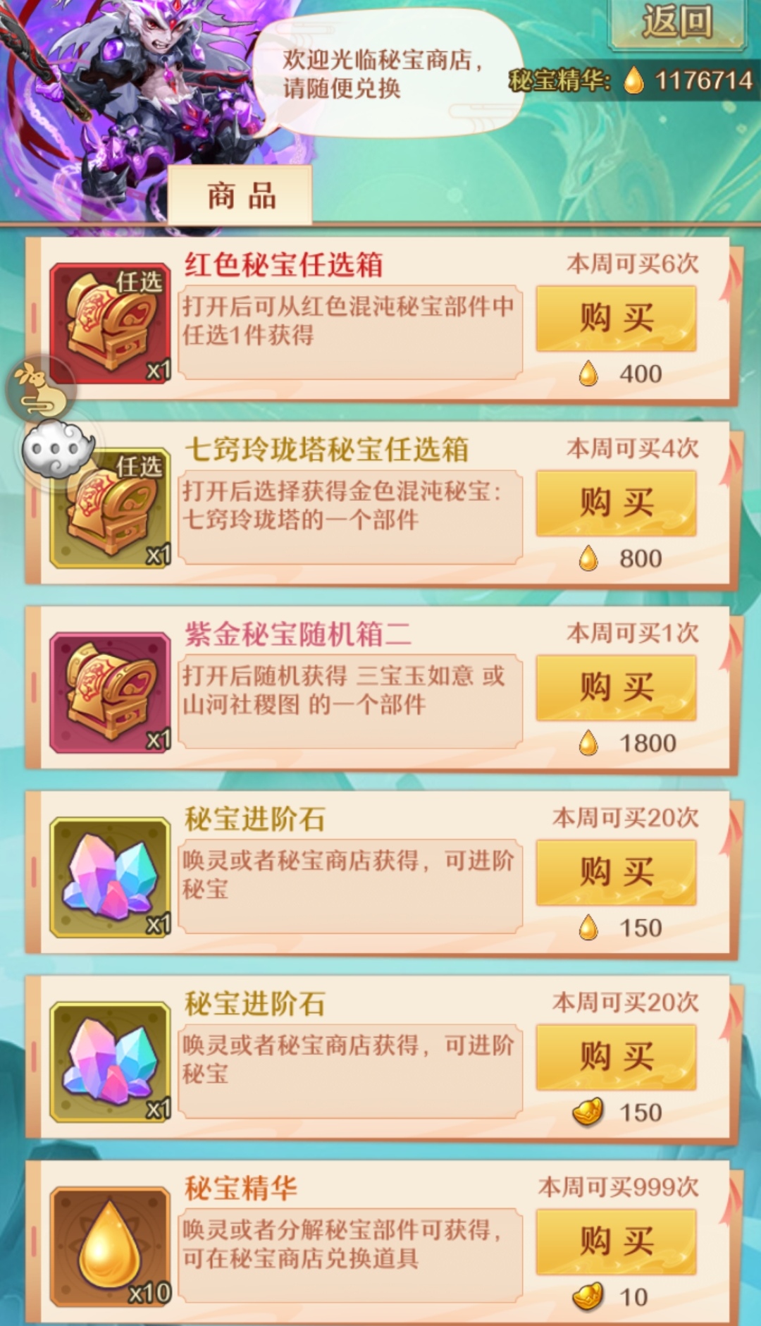 1,秘宝商店的购买优先级。【紫金秘宝随机箱2>七窍玲珑塔密宝任选箱>红色密宝任选箱>秘宝进阶石】