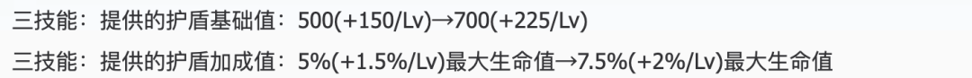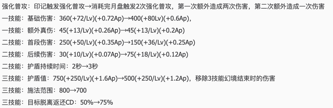 不出意外此次调整还是官方认为太超强了,超出预期。所以此次官方对其调整了多处地方,首先是一技能伤害由之前的360(+72/Lv)(+0.72Ap)调整到了400(+80Lv)(+0.6Ap),额外的真实伤害由之前的45(+13/Lv)(+0.26Ap)调整到了45(+13/Lv)(+0.2Ap),其次是二技能的第一段的伤害由之前的250(+50/Lv)(+0.35Ap)调整到了150(+36/Lv)(+0.25Ap),接着是后面的伤害由之前的30(+10/Lv)(+0.07Ap)调整到了75(+18/Lv)(+0.12Ap),同时二技能护盾持续的CD由之前的2s调整到了3s,最后是三技能护盾值由之前的750(+250/Lv)(+1.6Ap)调整到了500(+250/Lv)(+1.2Ap),同时移除了三技能幻境结束了的一个伤害,而且施放的范围也由之前的800调整到了700,在敌方英雄脱离了之后返回来的CD由之前的50%调整到了75%,此次调整之后其大招的施法范围直接减少了100码,这对于一个法师英雄来说是肉眼可见的削弱的,不过鉴于新英雄刚出还处于一个体验的调整阶段,后续官方会进行持续的关注以及调整。
