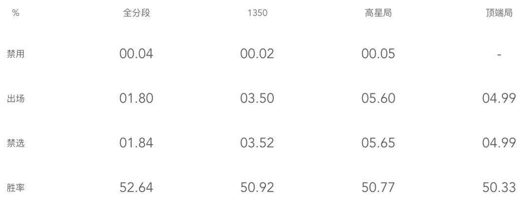 此次官方对其调整都是三技能有关,其一是护盾值上面由之前的500(+150/Lv)调整到了700(+225/Lv),其二是护盾的一个加成由之前的5%(+1.5%/Lv)最大生命值调整到了7.5%(+2%/Lv)最大生命值。官方估计是认为刘邦的强度一直不温不火,我们可以在上图数据可以看到它的出场率其实是少的可怜,而在所有分段平均的胜率是在50%左右,这局面就导致官方让其进行了加强。