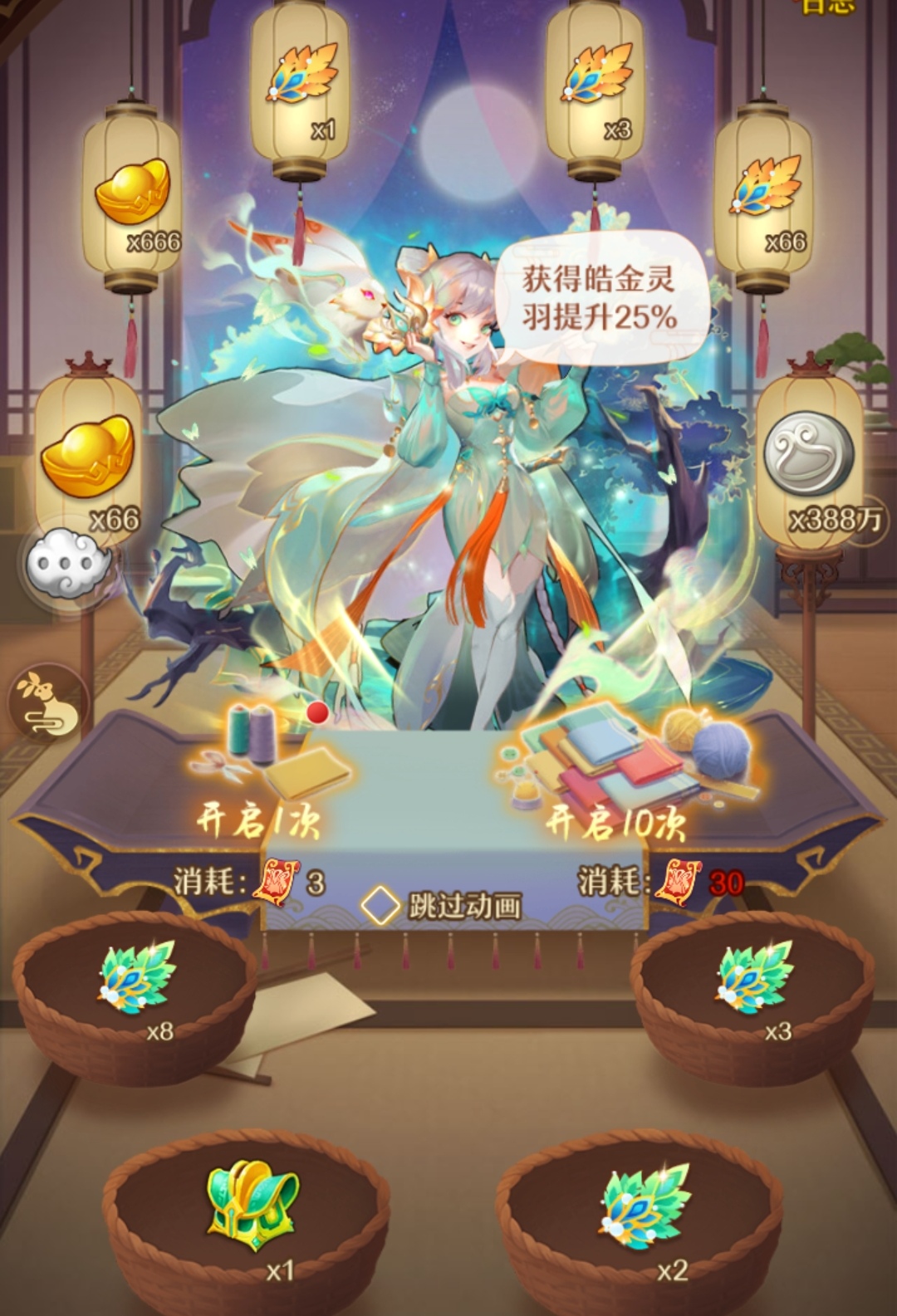一次获得需要RMB:元宝抽奖可获得600左右皓金灵羽。