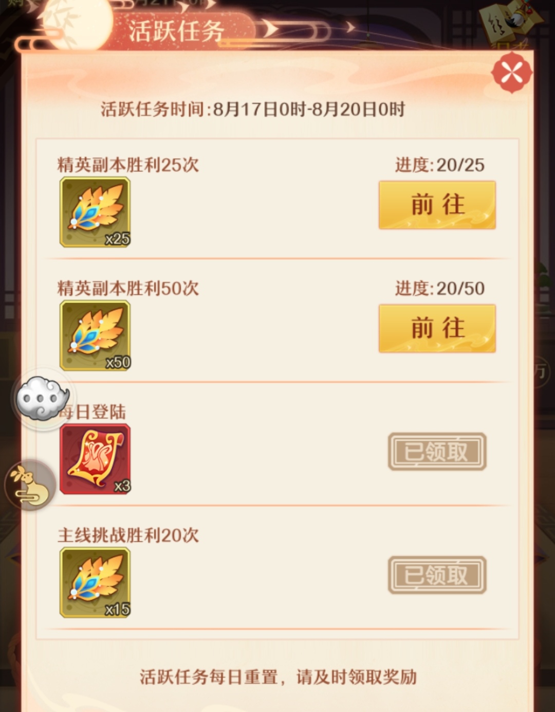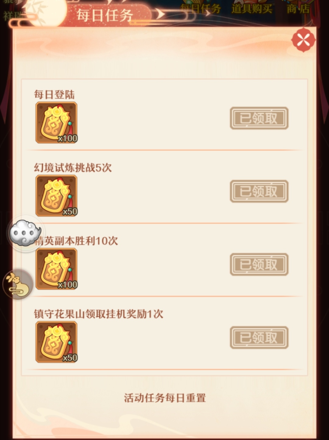 完成每日任务之后可以获得祥瑞令。