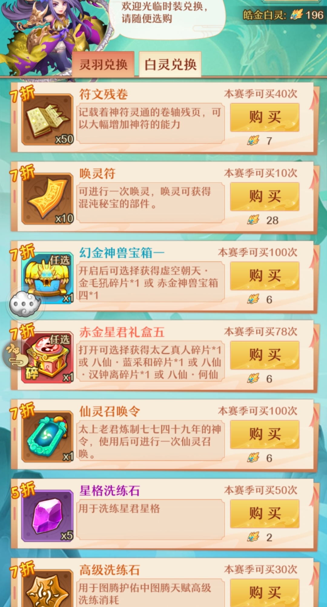 白灵兑换后期购买优先级。【唤灵符>皓灵石>高级星格洗炼石>灵粹>灵髓>皓灵䯝】