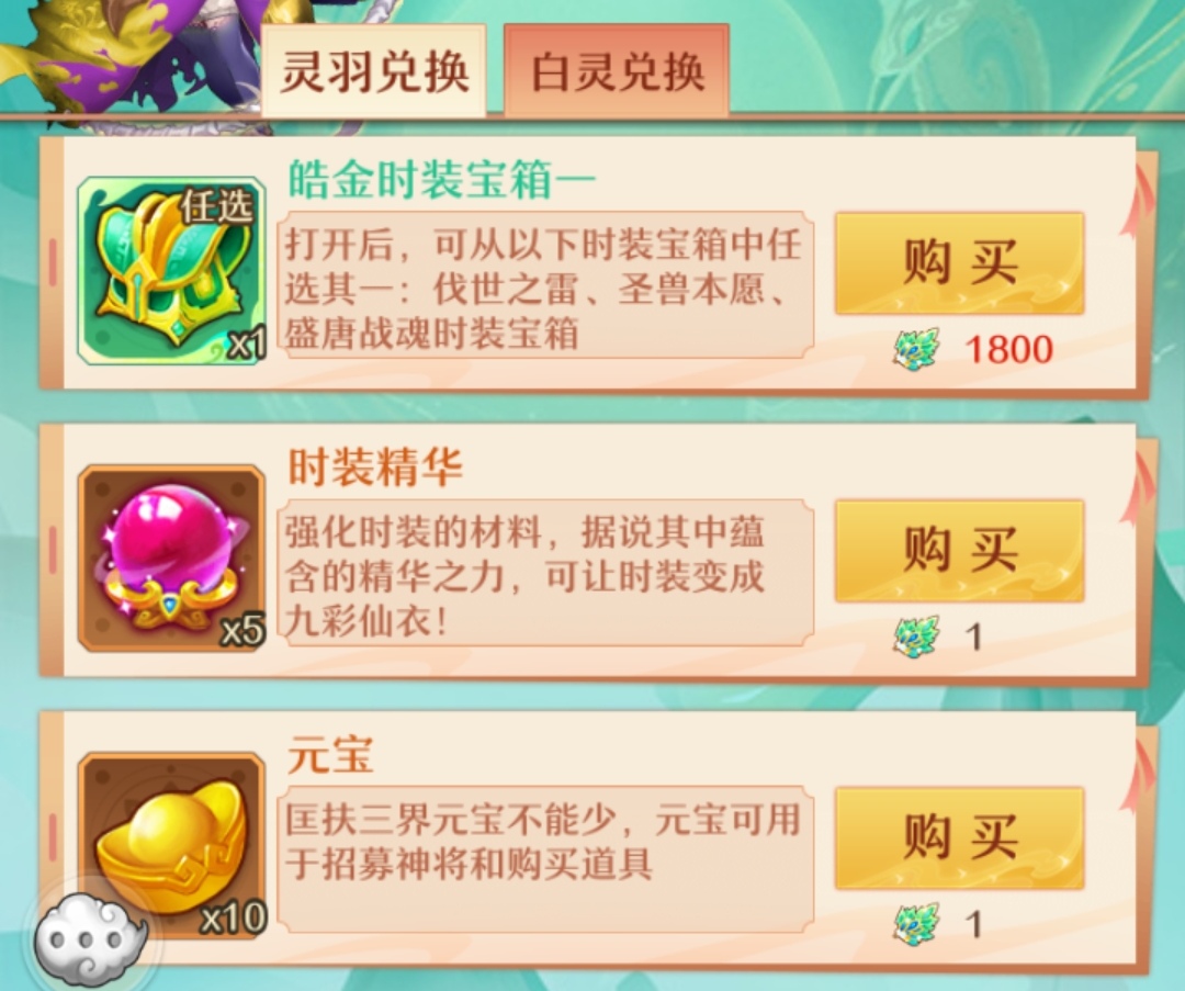 白灵兑换的前期购买优先级。【幻境神兽宝箱一>赤金星君礼盒五>换灵符>皓灵石>高级星格洗炼石>灵粹>灵髓>皓灵䯝】