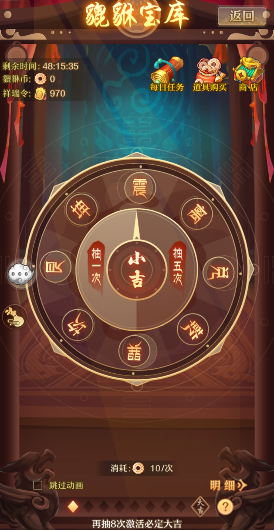 活动期间,单笔充值达到一定额度即可获取貔貅币,可额外获得祥瑞令。