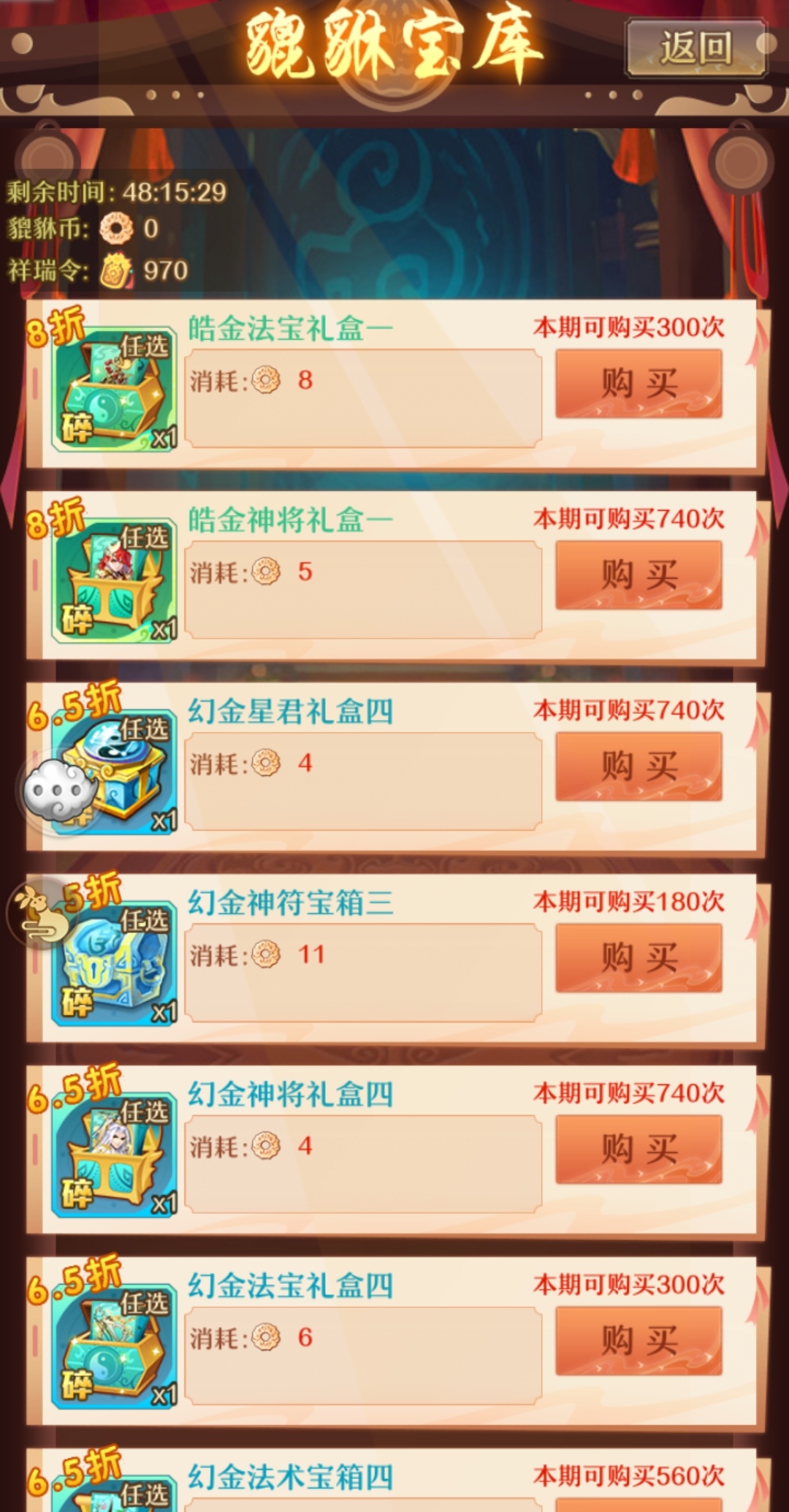 当然也可在貔貅宝库内兑换皓金神将礼盒一、皓金法宝礼盒一、幻金星君礼盒四、幻金神符宝箱三、幻金神将/法宝礼盒四、幻金法术宝箱四......