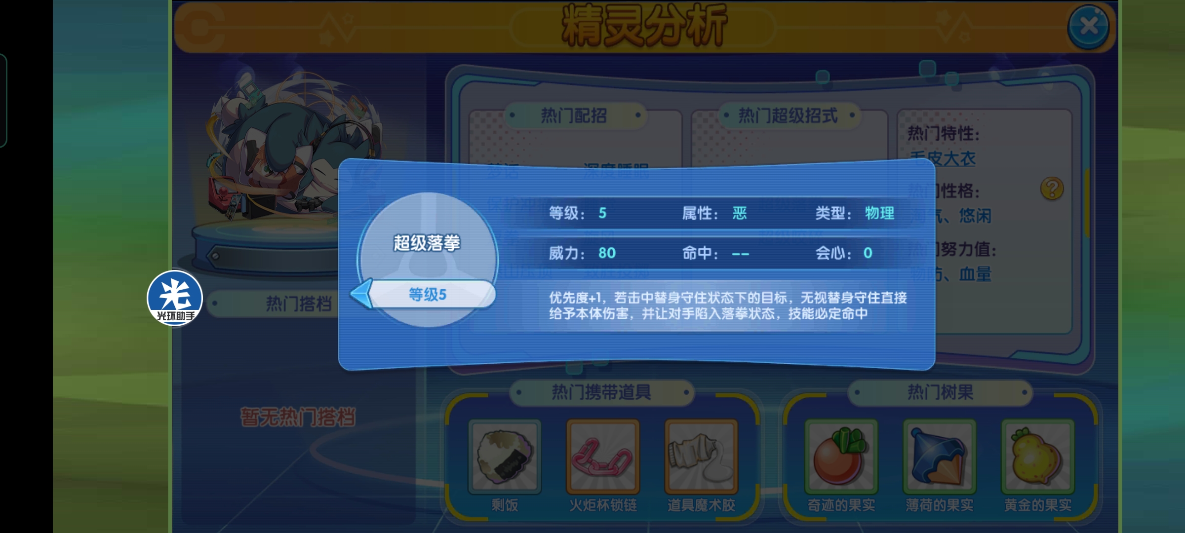这几个超级招式里我推荐开超级落拳或者超级泰山压顶。如果卡比兽带大力巴掌或者保护冲撞这些作为唯一的攻击技能的话,是打不到露莎蜜莱儿的,所以我们就需要超级落拳,也不用担心露莎蜜莱儿会带魔术胶和百变腰带,超级落拳一发就能带走它!如果你带了狂怒撕咬,则可以考虑开超级泰山压顶,打输出的同时还能使卡比兽的双防提高一级,以便卡比兽可以更好的站场。