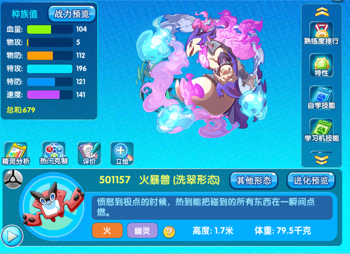 这个也是没办法的,毕竟新来的火暴兽肯定要热门一段时间,然后才能考虑老牌的火爆兽,关于这个精灵,当时第一个版本的时候速度非常的慢,但是血量非常高,到后来我也是吐槽了一下,然后好多群友都进行了反馈,然后进行了调整,成功变成了现在的这个样子皮脆,但是伤害高,速度快,很符合幽灵火属性的设定。