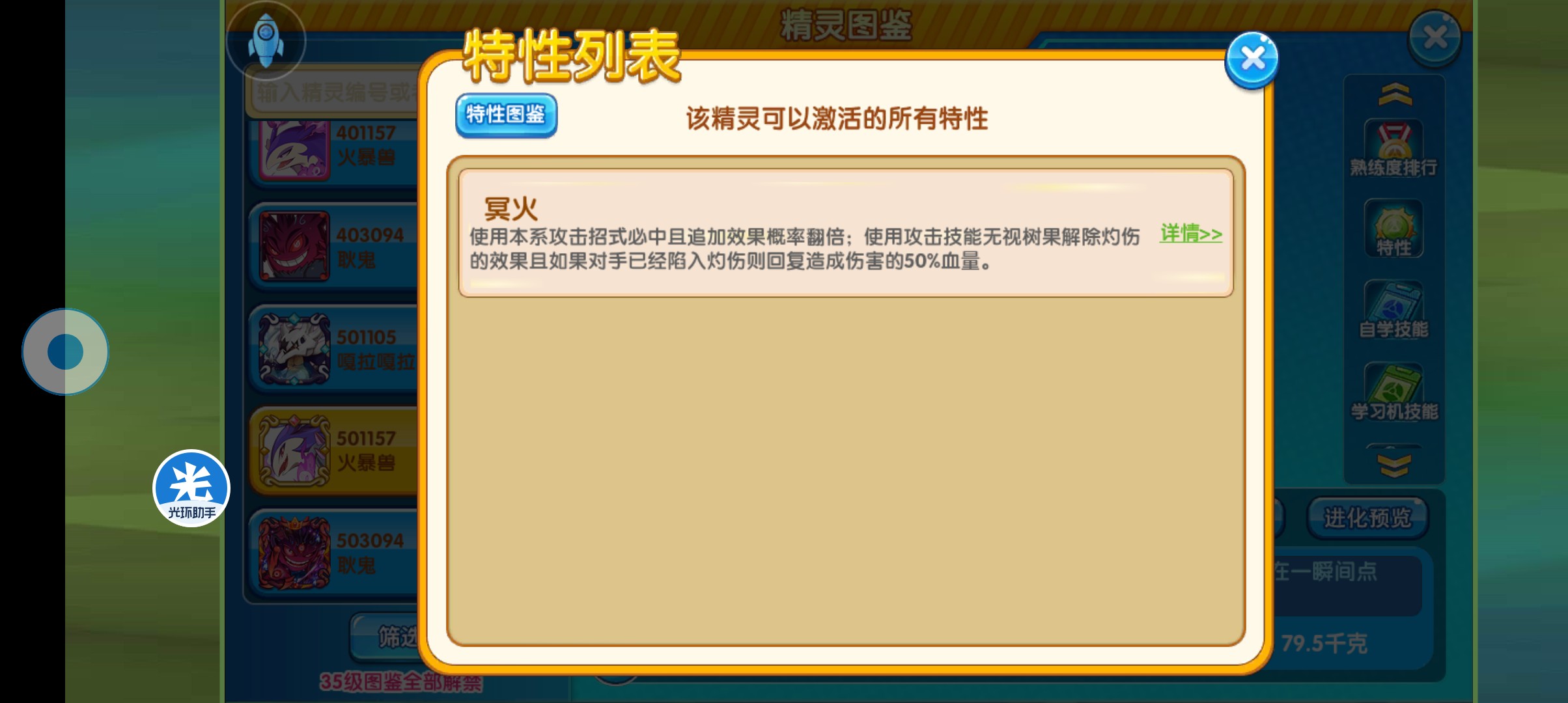 那么,剩下的技能就是炼狱,也是比较关键的,因为这个技能命中率虽然说只有50%,但是利用这个特性必定命中这个命中率的副作用就没了,必定让对方陷入多少,再加上这个精灵的特性,可以无视对方的果子,只要对方是除火属性以外的物理输出,基本上遇到炼狱这个技能就直接白给。