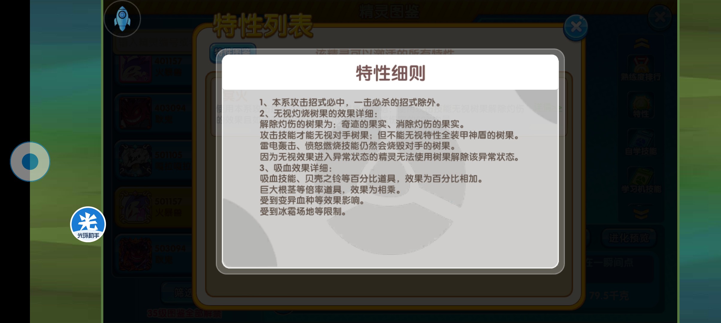 那么,关于这个精灵的特性,大家基本上在这里看看就可以了,基本上就是火和幽灵属性的招式必定命中,然后这两种技能的追加效果翻倍,比如说喷射火焰10%能够让对方陷入灼烧,那么配合这个特性就是有20%的概率了,同时,使用攻击技能还可以无视对方,可以解除灼烧的果子,直接将对方打进灼烧状态,这就和火焰鸟用愤怒燃烧打掉对方果子让对方直接陷入灼烧状态是有些类似的。