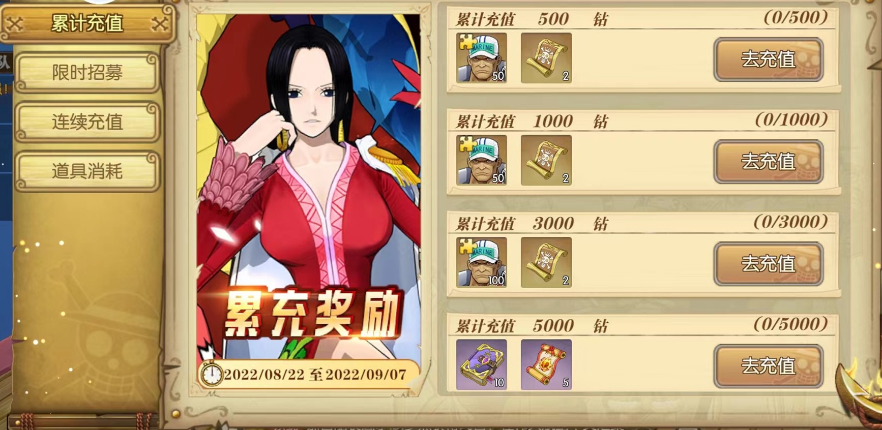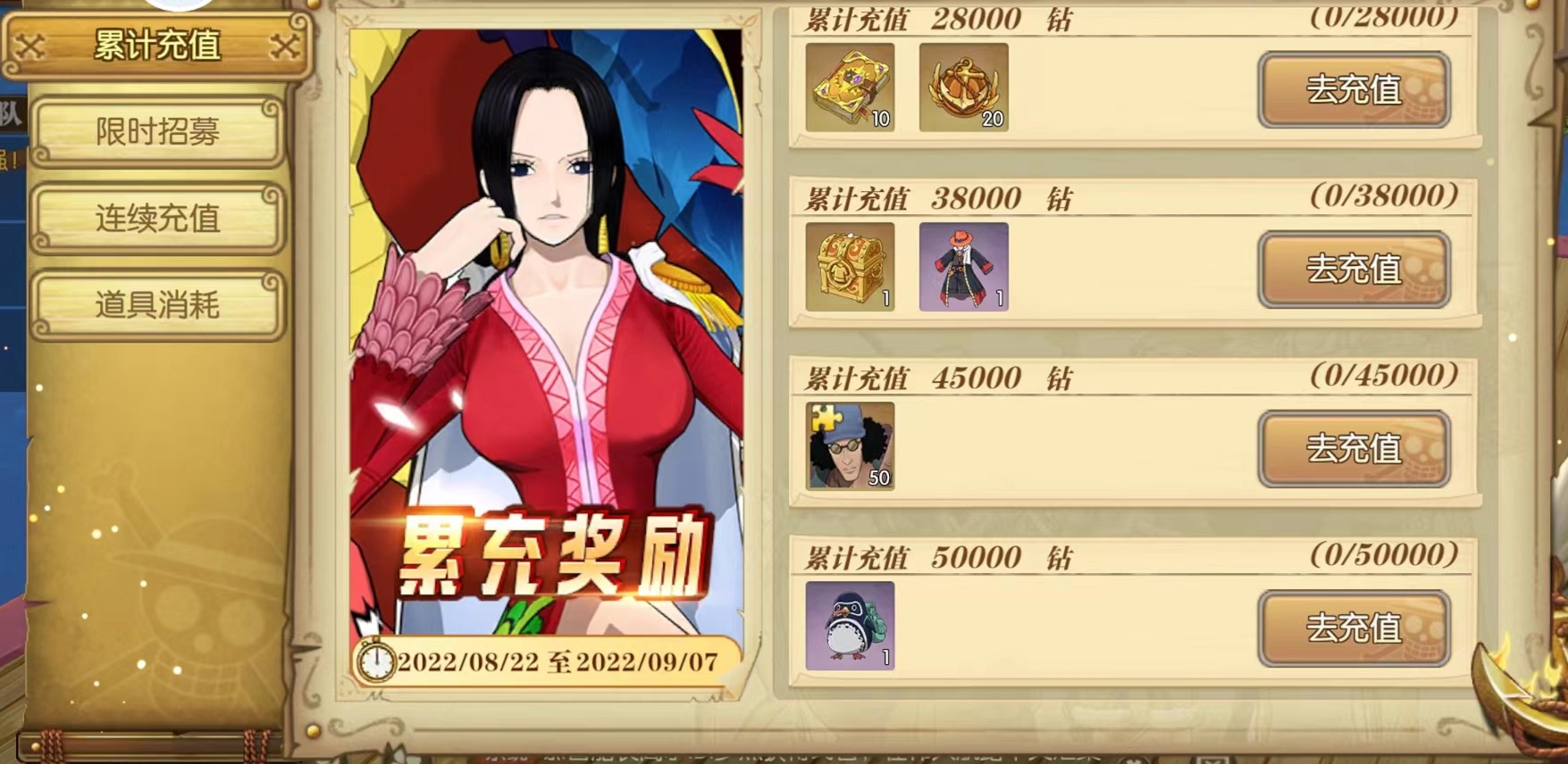 那么你就得考虑充值活动送的库赞与消耗卷子活动送的弗兰奇。因为这2名限定人物,能直接提升你过主线航线天梯的体验。以氪金5000为最低考虑。