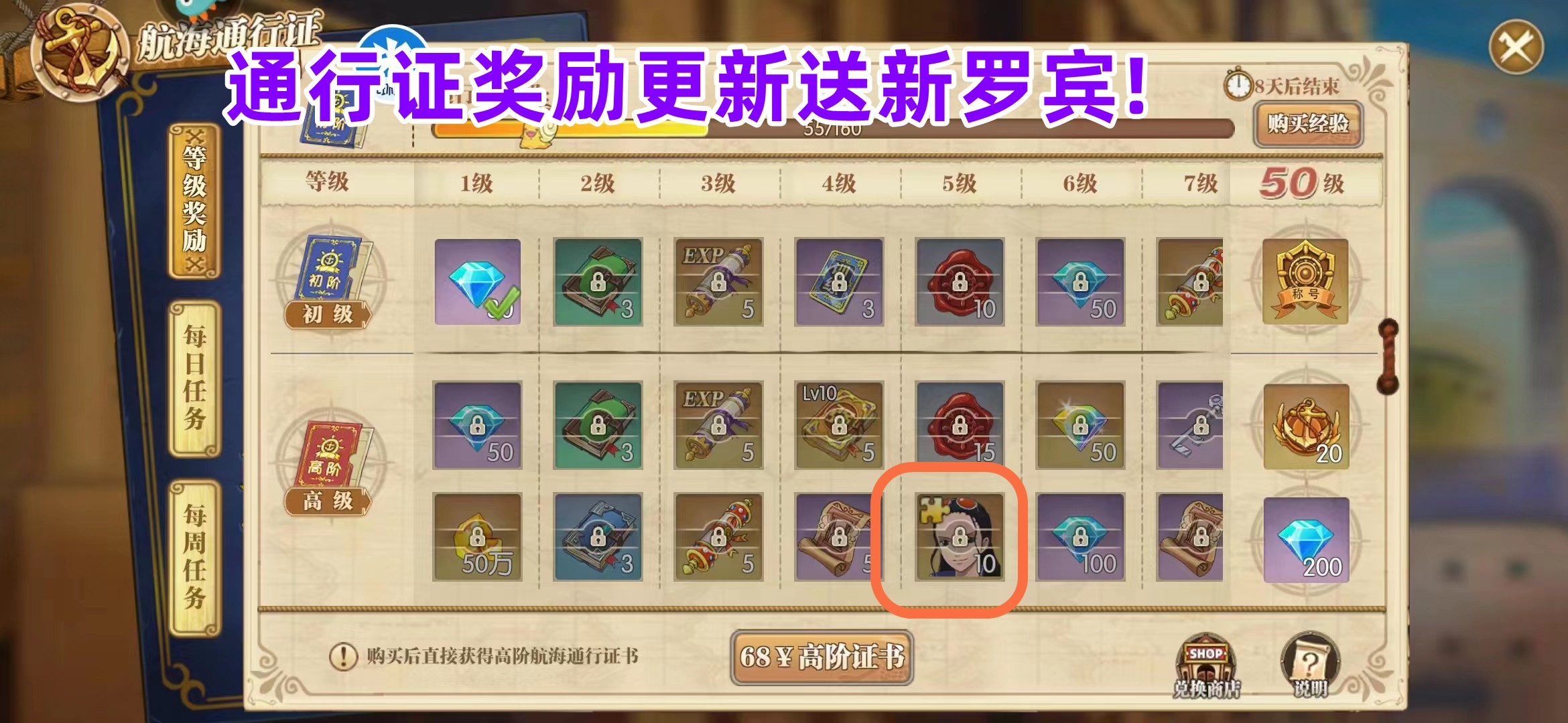新区不仅有新世界库赞、弗兰奇、还有通行证里面可以获得新世界罗宾,罗宾核心在于助阵效果能随机给一人提速速度和减伤方面的效果。氪金玩家可以考虑升级通行证等级加速获得罗宾。