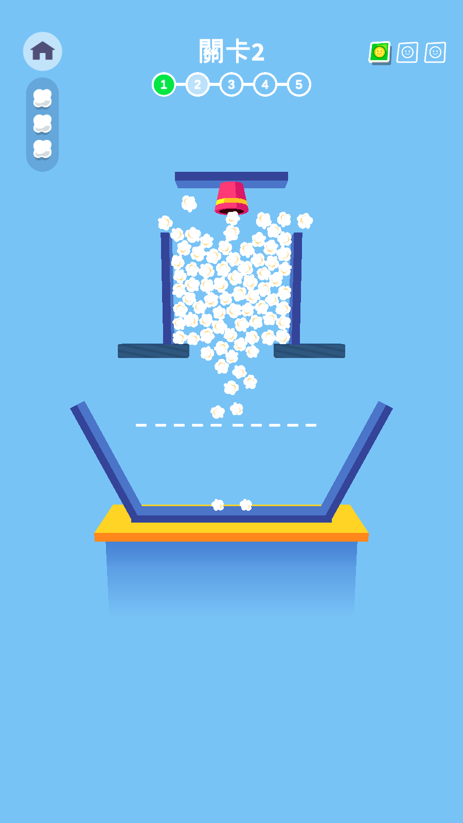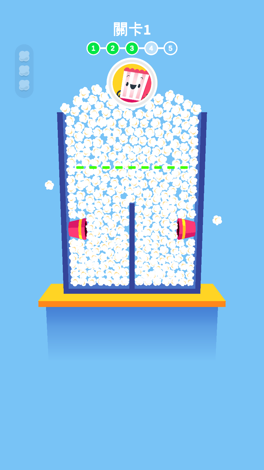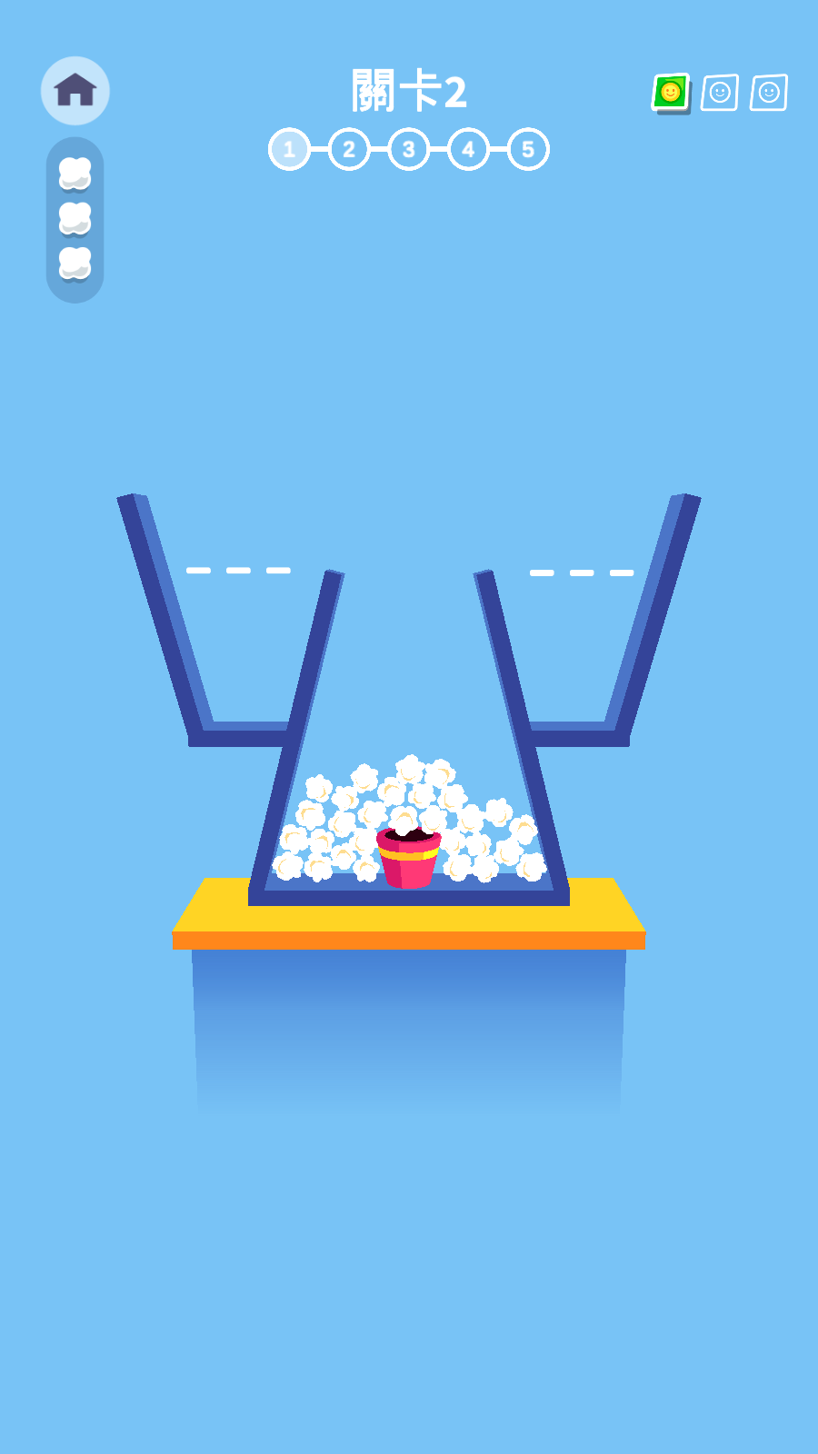 游戏的玩法非常简单。玩家会面对各式各样的爆米花填充场景:常规的梯形、圆形桶,奇妙的三角型桶,又或者是一些奇形怪状,让人意想不到的形状……玩家需要做的,就是长按屏幕,让爆米花源源不断的出口蹦出,将容器填充至标准刻度处。
