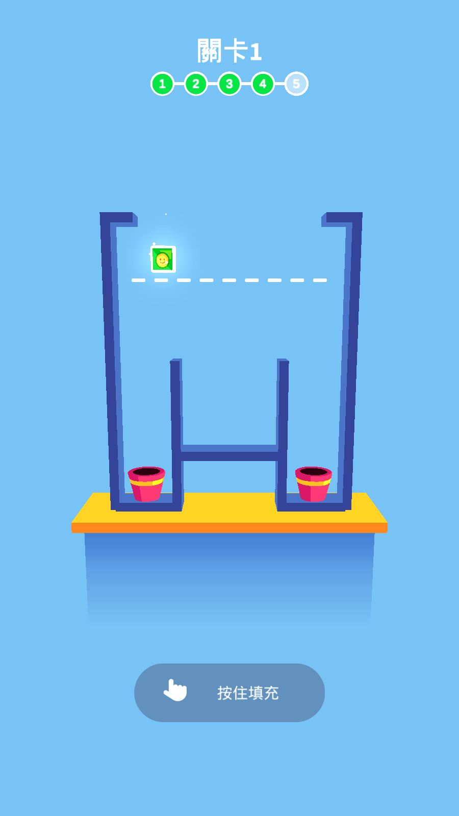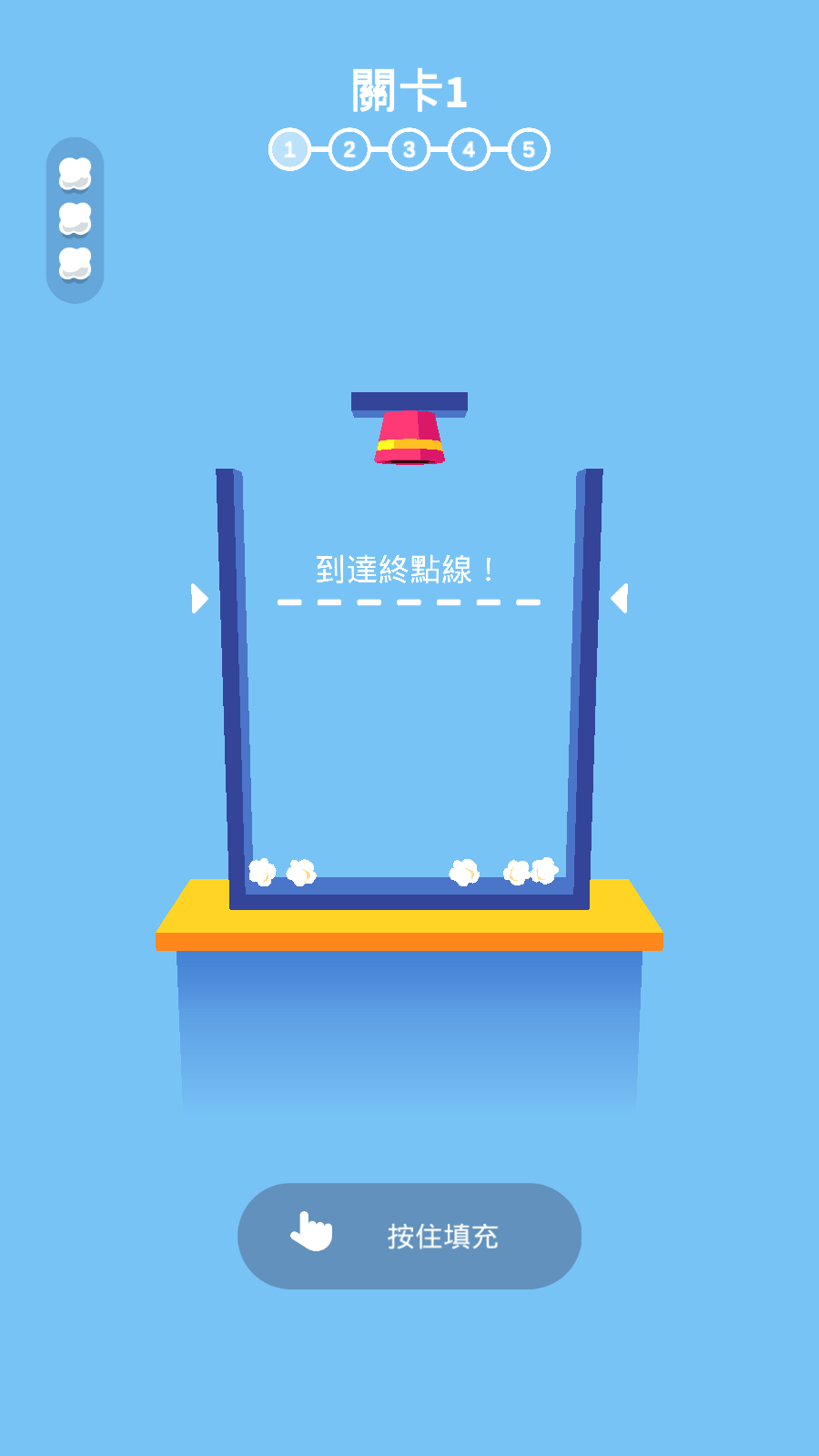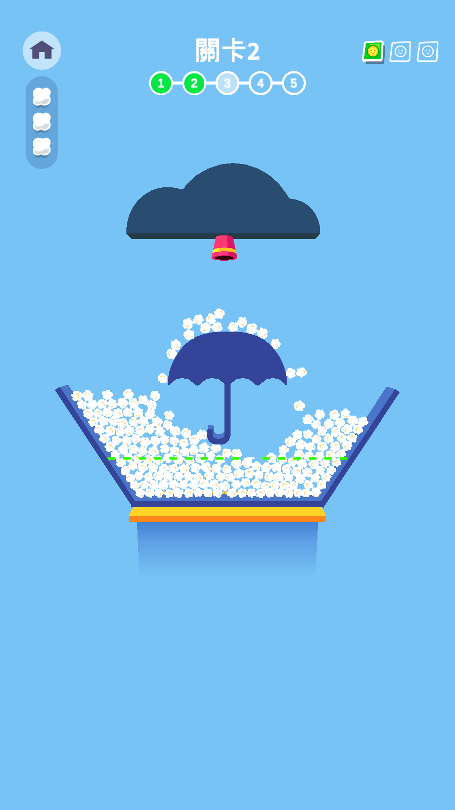 游戏的玩法非常简单。玩家会面对各式各样的爆米花填充场景:常规的梯形、圆形桶,奇妙的三角型桶,又或者是一些奇形怪状,让人意想不到的形状……玩家需要做的,就是长按屏幕,让爆米花源源不断的出口蹦出,将容器填充至标准刻度处。