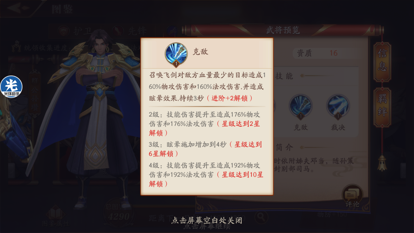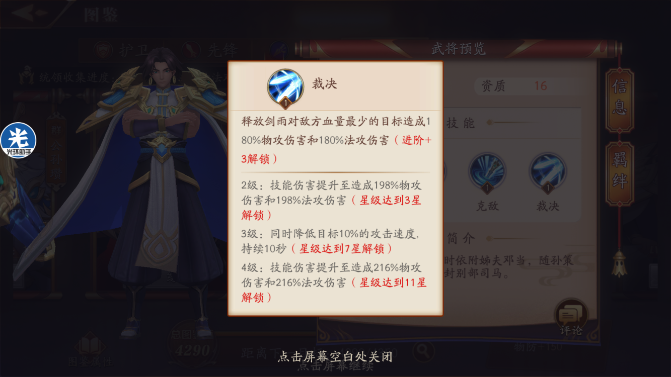 武将:吕蒙; 性别:男; 所属国家:吴; 品质:红; 资质:16。