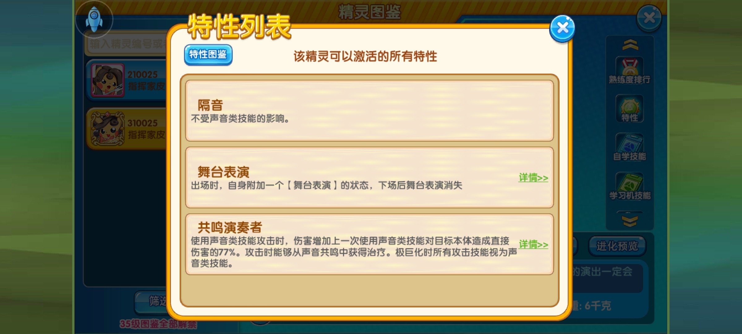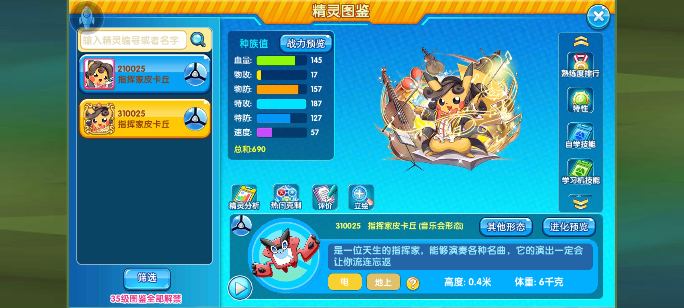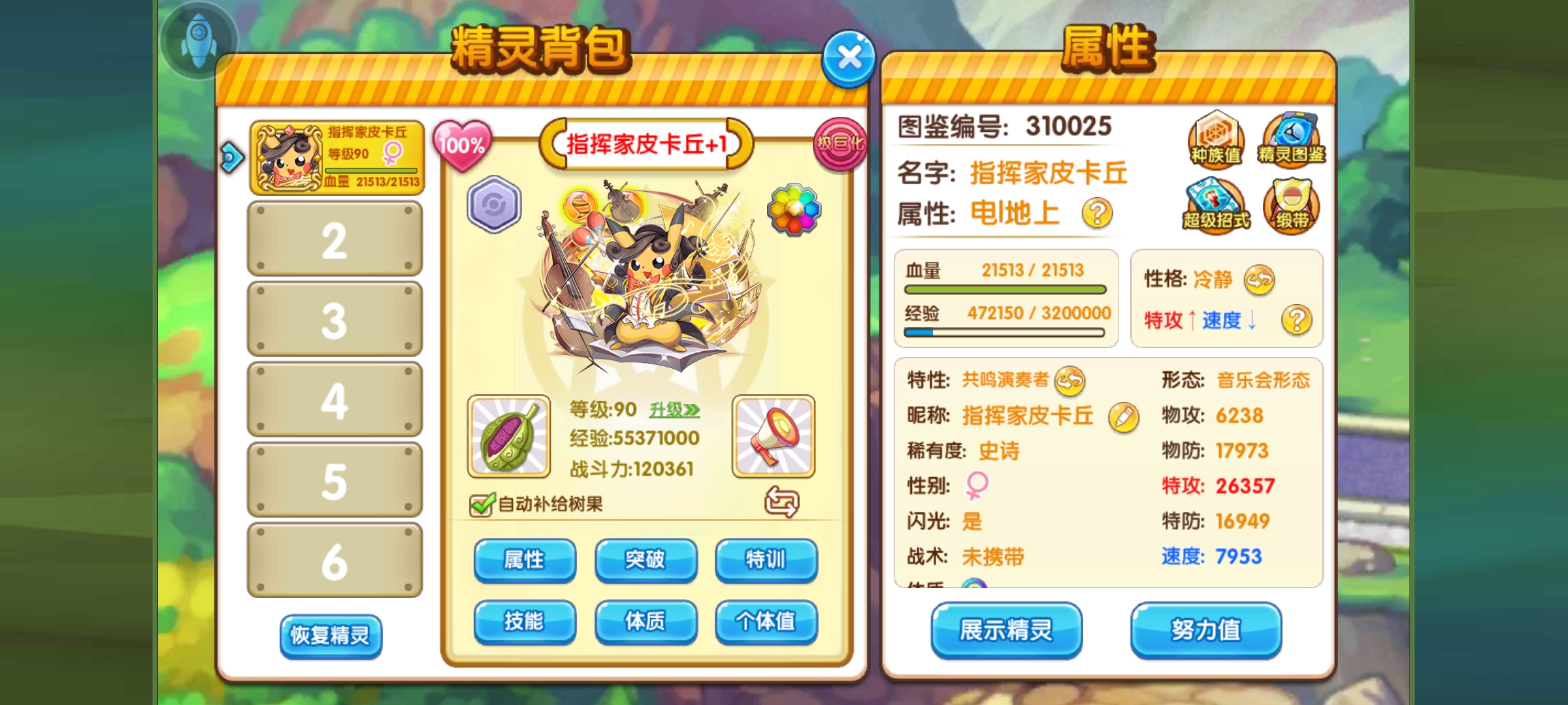 这是一张满配的面板图,187的特攻换来了2.6w的特攻,可谓是面板真实绝大部分精灵了(暗示当年某黑白龙)因手滑亲密度点多了,速度线的话是达不到最低了。相对比去年的溜溜球皮卡丘,指挥家皮卡丘更加为强大。得源于它优秀的精灵特性。