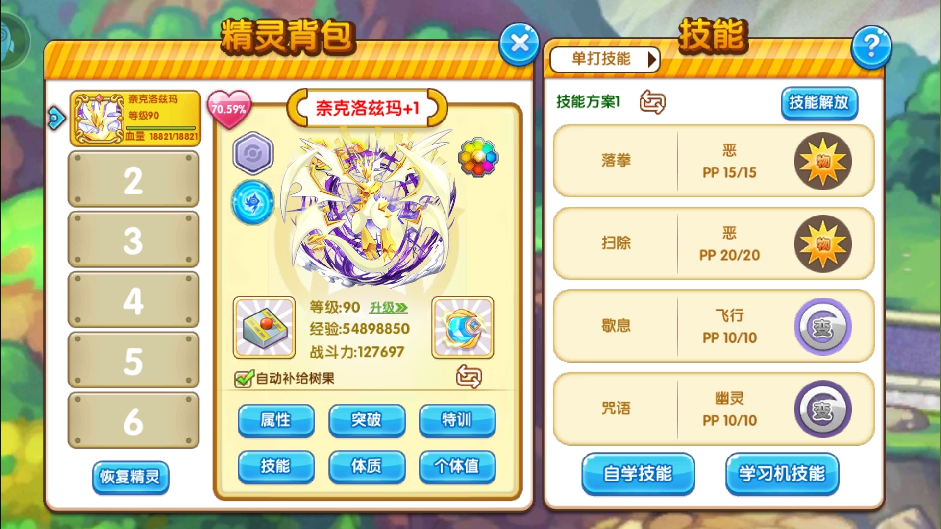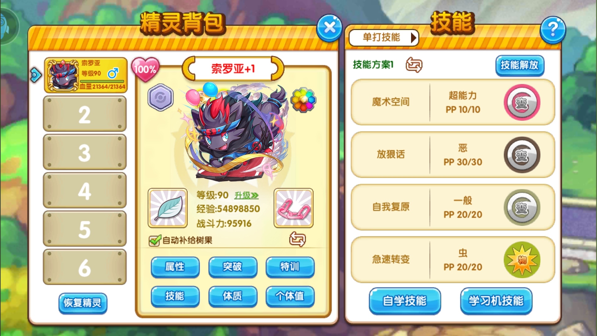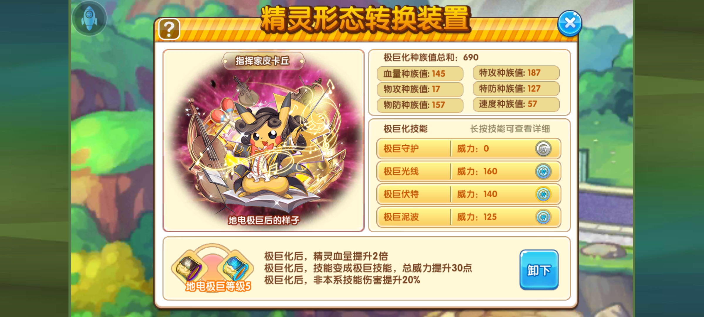 这是一张满配的面板图,187的特攻换来了2.6w的特攻,可谓是面板真实绝大部分精灵了(暗示当年某黑白龙)因手滑亲密度点多了,速度线的话是达不到最低了。相对比去年的溜溜球皮卡丘,指挥家皮卡丘更加为强大。得源于它优秀的精灵特性。