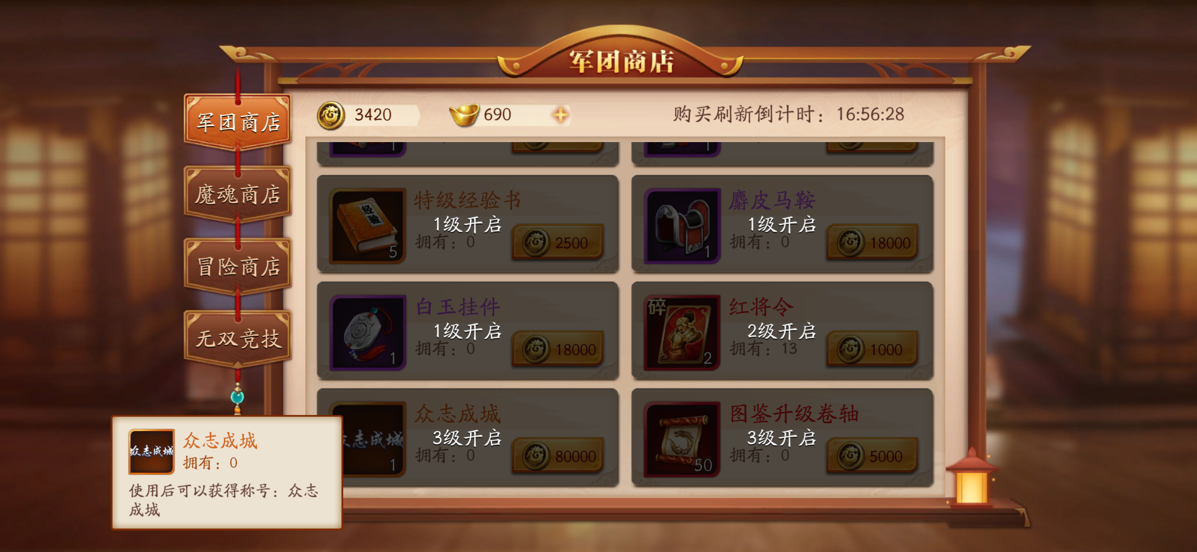 当然,购买也是有条件的,一是军团等级要3级,二是需要军团币有8w便可以购买。