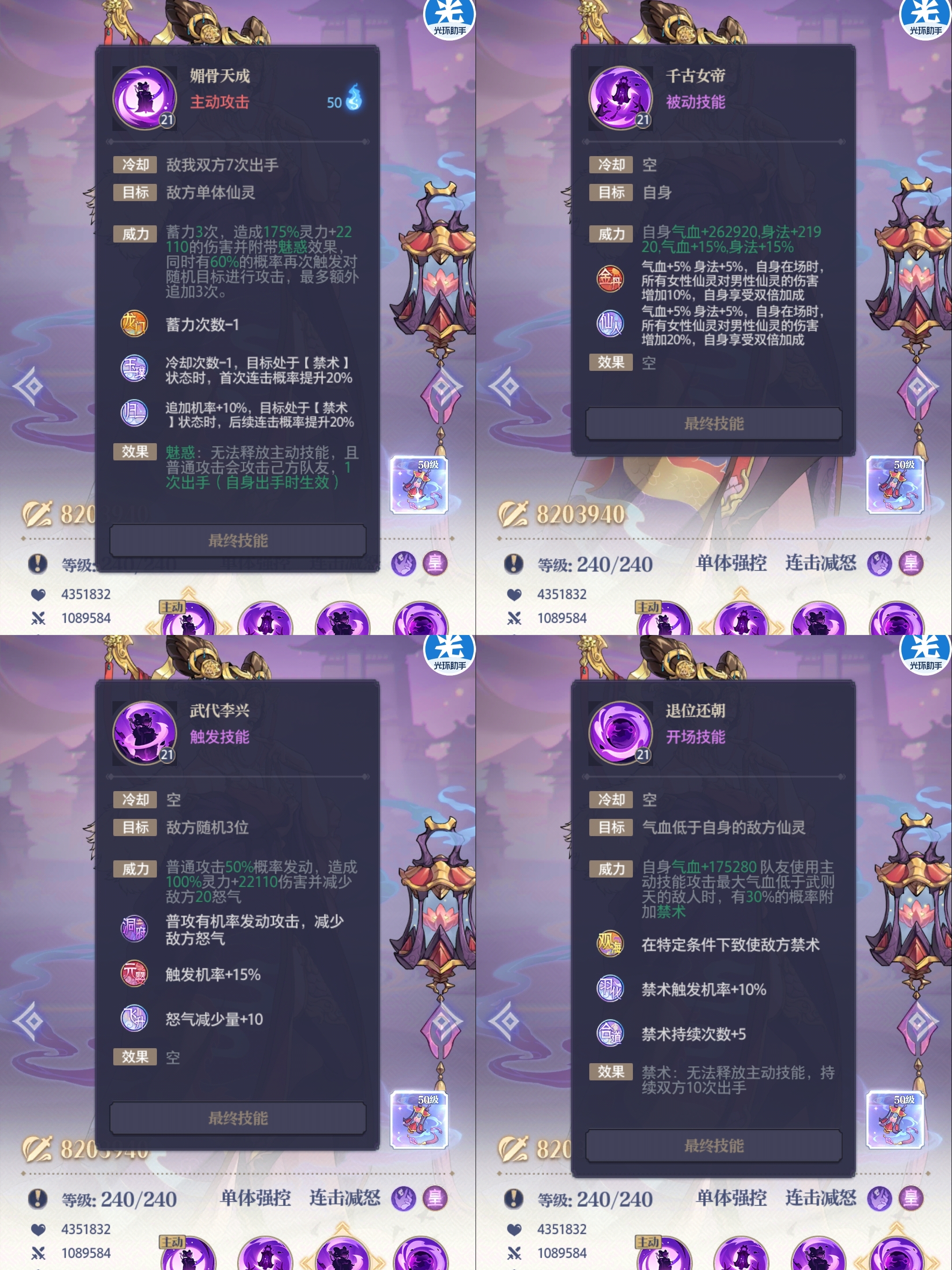 四技能:队友攻击敌方时,敌方最高血量少于武则天最高血量,有概率触发禁术,无法释放主动技能。