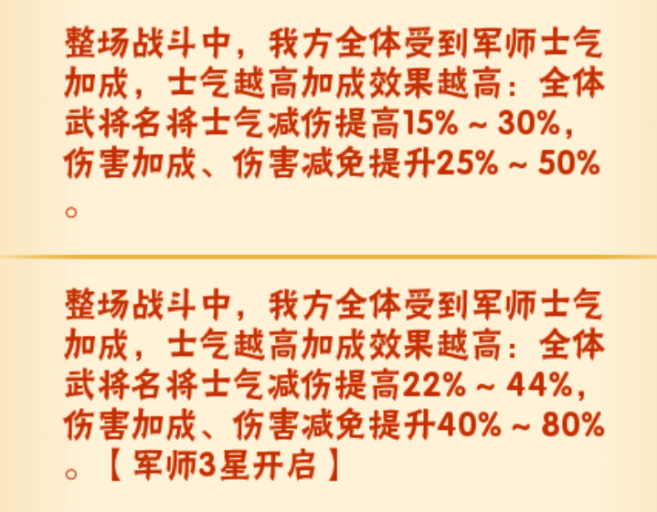 破阵摧坚效果:攻击、伤害加成提升【一星后】怒气或龙魂攻击时受击单位生命(包括生命盾和兵甲)越高本次攻击的额外伤害加成越高,最高额外提升30%;2回合