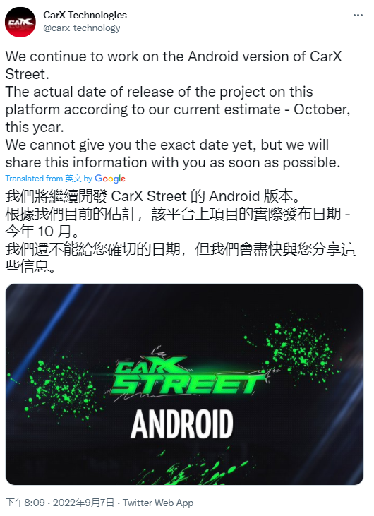 9月7日最新消息,开放世界模拟竞速游戏《CarX Street》官方发布推文,宣布预计今年10月将于海外发布安卓版本,具体日期待定!