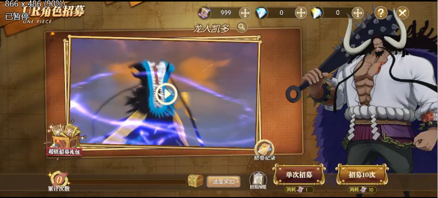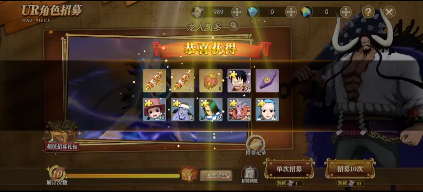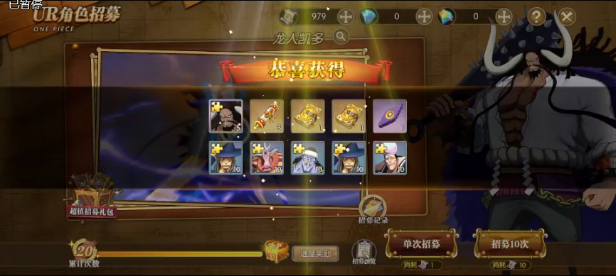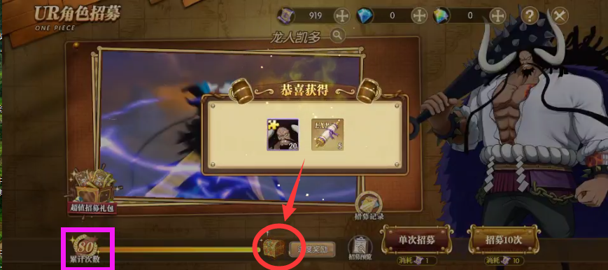 2、UR卡池招募的过程中,有机会掉落龙人凯多碎片,奖励有5个凯多碎片、4个凯多碎片或80个凯多碎片。
