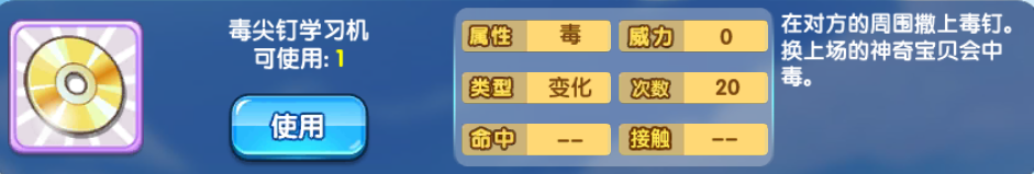 该技能的效果是下一层钉子,对面交换上场的宠物可以陷入中毒状态,如果继续下一层,就会让对面陷入猛毒状态,如果说已经陷入了中毒状态,则不会再次陷入猛毒状态。