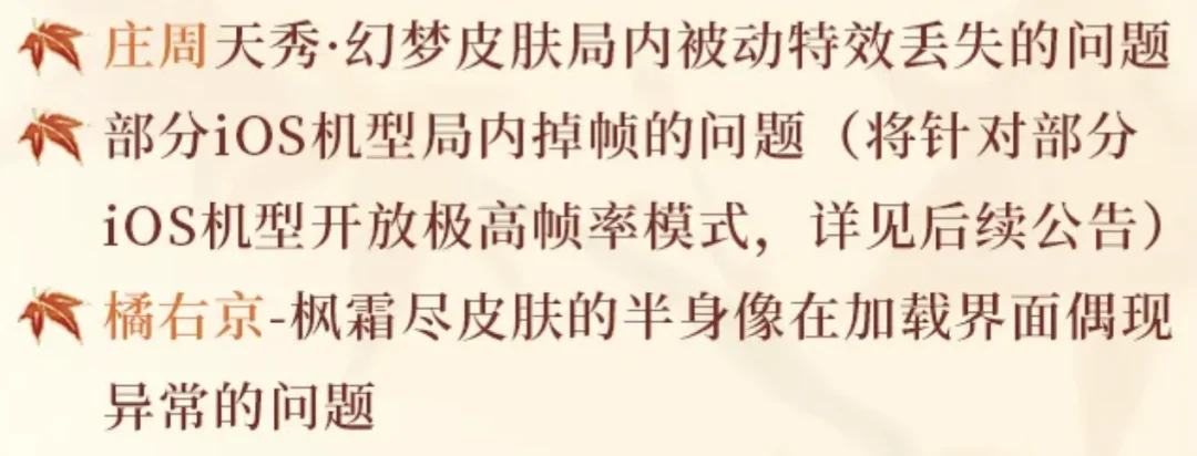 首先修复的是庄周的新皮肤【天秀-幻梦】,主要是修复这个皮肤在游戏里被动效果修饰的问题,算是一次官方的紧急修复优化,其实【天秀-幻梦】皮肤的评分不是很理想,所以此次修复也是情理之中。其次是官方修复了在IOS系统下部分机型的游戏掉帧问题(IOS16),同时官方还会对一些苹果IOS设备进行专门的优化和放开极高帧率选项。最后一项修复的是橘右京的新皮肤【枫霜尽】,其在游戏加载画面的时候半身会时不时出现异常的问题。
