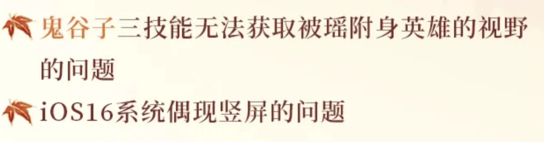 此次主要官方修复鬼谷子三技能没有办法获取被瑶瑶的附身英雄视野的问题。其次还是对IOS16新系统时不时出现竖屏的问题,希望尽快优化IOS16系统的一些问题,确实对游戏体验不是很好。
