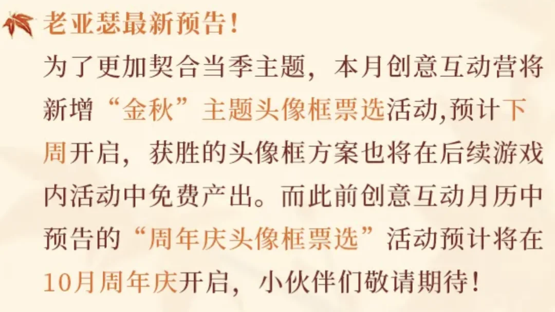 官方此次贴合目前对主题在创意互动的板块增加一个【金秋】的主题头像框投票选择,当该会在下周开启投票,票数多的一方方案会在后面的活动进行免费发放。(需要做任务才会送噢)。