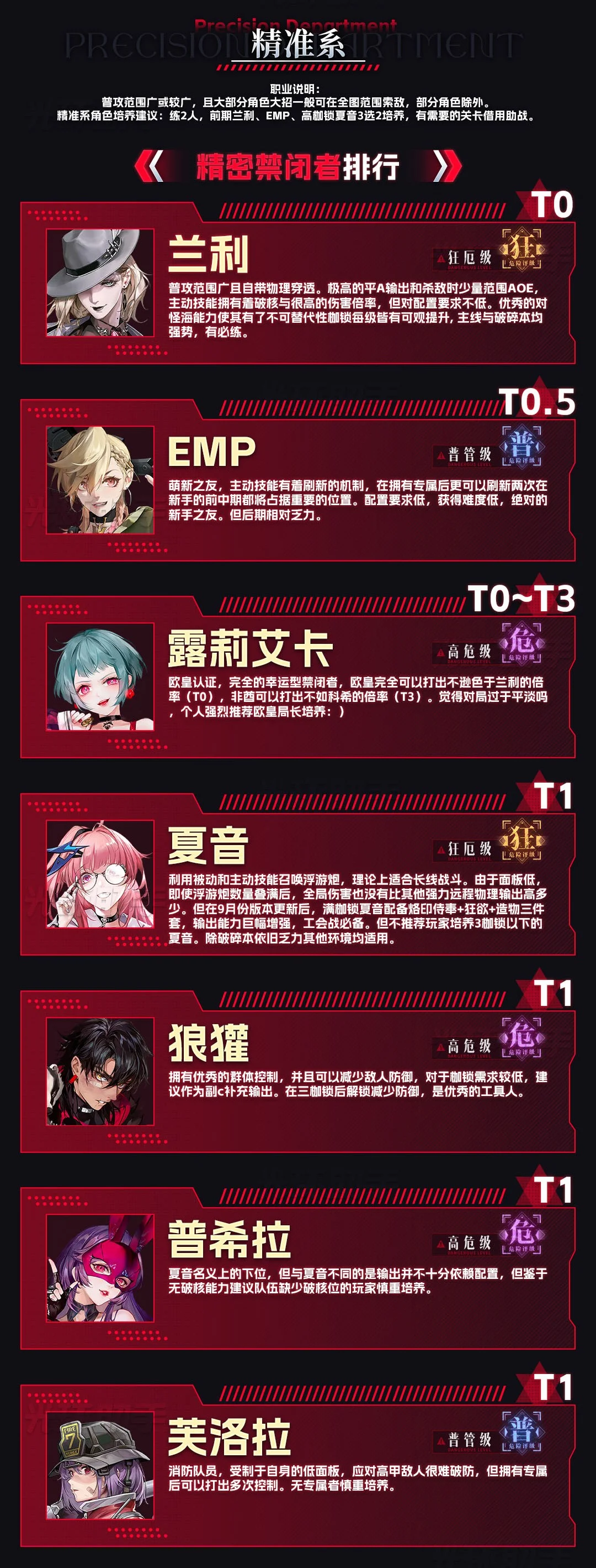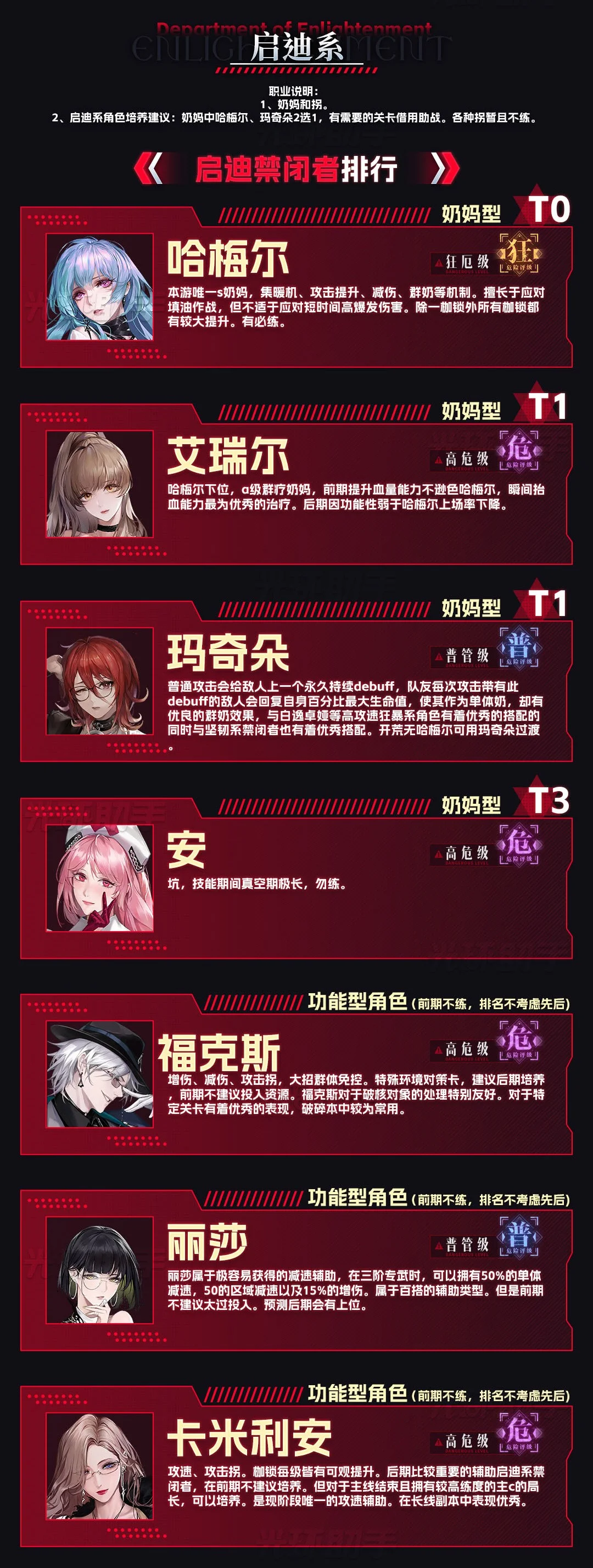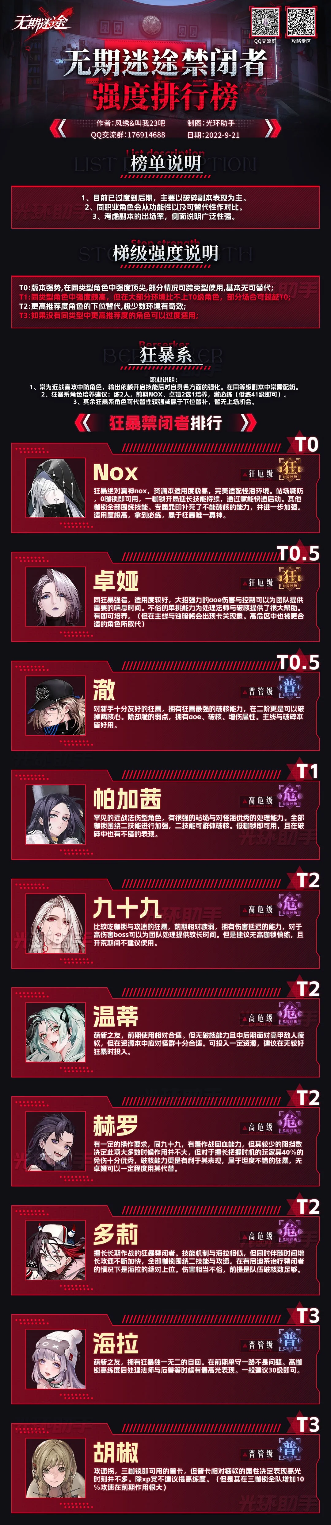 《无期迷途》禁闭者强度排行榜v3.0光环-欧猫发布于 2022-09-23关注1、目前已过度到高难副本,主要以破碎副本表现为主。2、同职业角色会从功能性以及可替代性作对比。3、考虑副本的出场率,出场率高代表广泛性高。