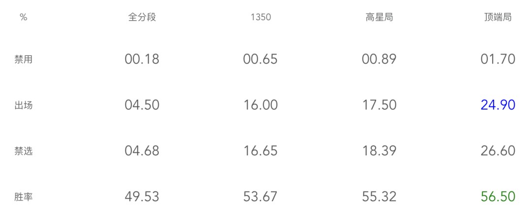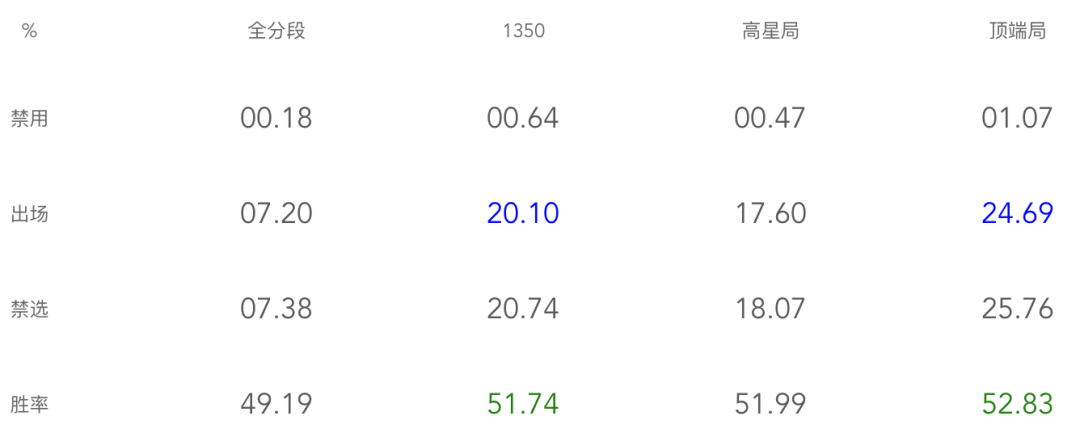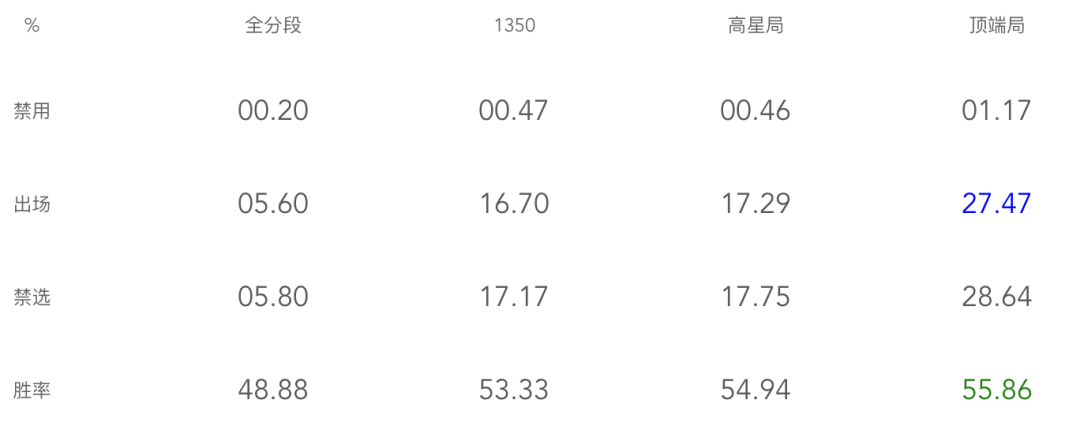 除了上述出场率高和胜率高的英雄以为,在新赛季里也有出场率不出彩但胜率不错的英雄,嫦娥在顶端局有着57.81%的胜率,而阿骨朵更是有着59.78%的胜率位居第一名,但这两位英雄在出场率方面都是只有0.7%以及0.8.12%,出场率不是很出彩。路人局嫦娥在新赛季被用作中路居多,而阿骨朵路人局单排情况下它自身强度不是很好所致,在全分段数据不是很好看。