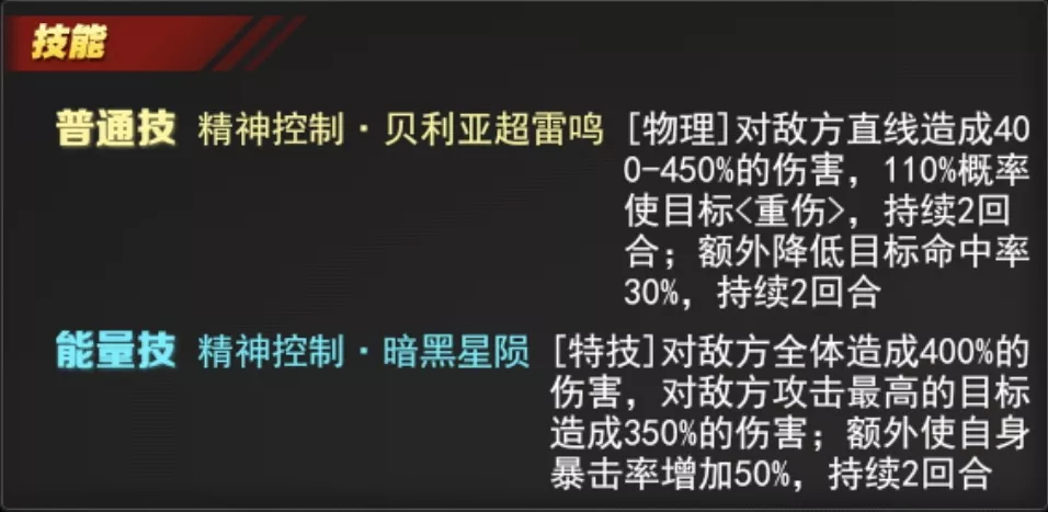 [物理]对敌方直线造成400-450%的伤害,110%概率使目标<重伤>,持续2回合;额外降低目标命中率30%,持续2回合。