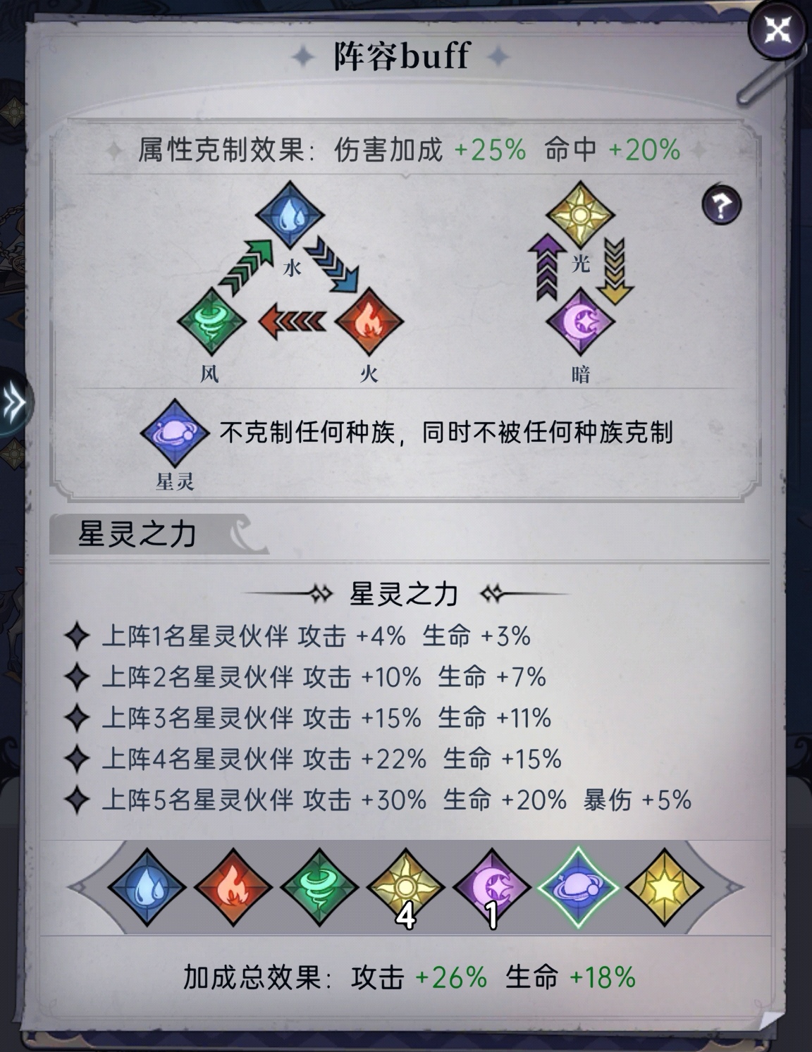 如图,星灵种族不克制任何种族,同时也不被任何种族克制,阵容加成数值和光暗加成类似。