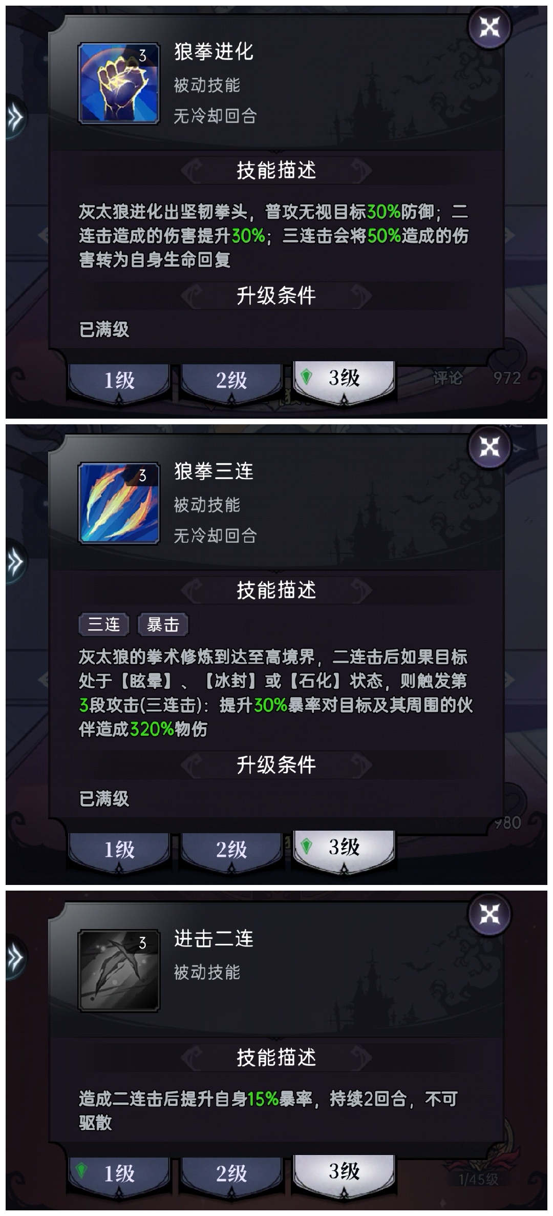 (2)灰太狼技能系数高。简单说下,灰太狼三连击系数是100+200+320=620,连击天赋或者符文会触发三连击620*0.5=310,同时鸭子的连击也可以触发三连击,620*0.65=400,抹杀100,所以灰太狼单回合对前排输出极限可以达到620+310+400+100=1430%攻击,如果暴击,可以将近3000%攻击,很变态了。