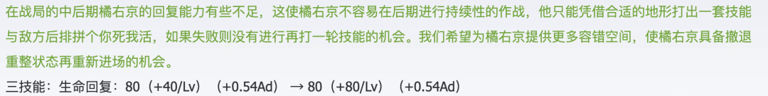 此次官方对其调整三技能回复方面等级的加成由之前的40调整到了80,因为之前官方是对其都有陆陆续续进行加强的,优化手感加强二技能等等操作,但是胜率却是平平无奇,目前官方估计还没有找到该英雄的突破点。