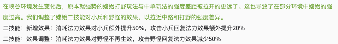 此次官方对其调整二技能增加了个消耗法力来对小兵有额外提升50%的一个效果,同时打小兵的话能够回复的是可以额外提升20%效果,最后消耗法力效果不能再对野怪生效了,同时统计野怪回复法力效果减少50%,官方这样说就是直接削弱其打野的一个能力,但是它又给你加强了清理兵线的能力,简单来说就是对线的能力得到了加强,但打野强度削弱。