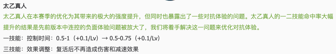 此次官方对其调整一技能控制CD由之前的蓄力能增加时间最大1s调整到了最大0.75s,其次是三技能复活英雄不能在造成减速和伤害了,而且最近其胜率也是非常高的一个状态,官方这样调整肯定是认为最近的表现有些出乎意料,此次调整之后其一技能以及三技能都是一个削弱的状态。
