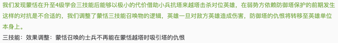 此次调整三技能召唤士兵不可以在蒙恬越塔的时候来吸引其仇恨效果了,简单点来说官方这样调整就是让其在对局里越塔的能力削弱,减少强杀几率,有些说是加强有人说是削弱,小伙伴们您怎么看此次官方对蒙恬的调整?