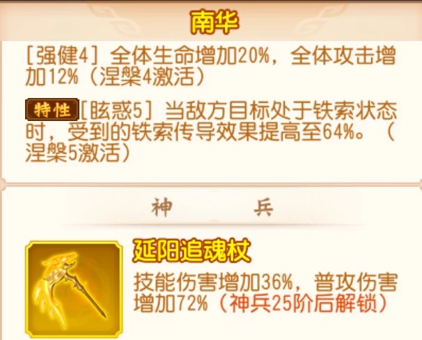 总结:南华是对中毒,烧伤,眩晕,麻痹,沉默的异常的输出武将,异常数越多伤害越高。铁锁的武将受伤也多