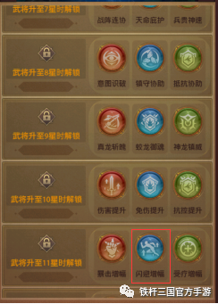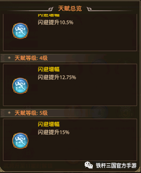 蜀国闪避流核心武将关羽,11星天赋解锁的天赋:“闪避增幅”升级至5级可获得15%闪避,可以増加额外的闪避率。