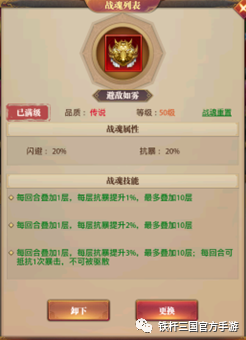 战魂首选避敌如雾,闪避流必须使用避敌如雾战魂,强化50级后提供20%的巨额闪避加成,是闪避流武将必备战魂首选。